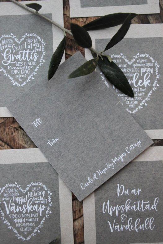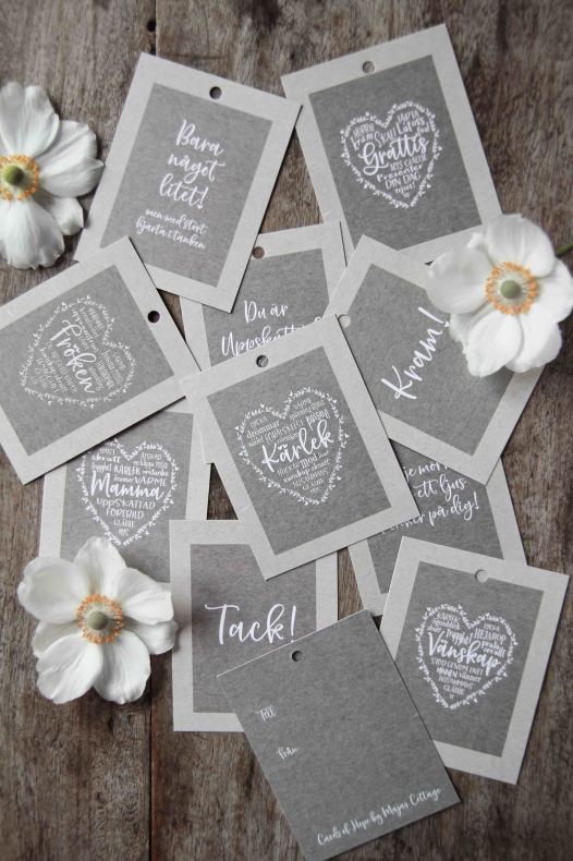 Gåvokort från Majas Cottage i 200 grams obestruket papper med hål för snöre och band.