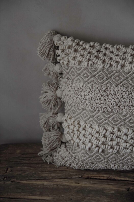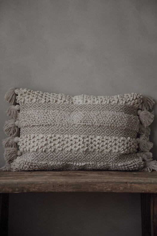 Mysigt kuddfodral Boho från Majas Cottage i grövre bomull. Tofsar på kortsidorna.