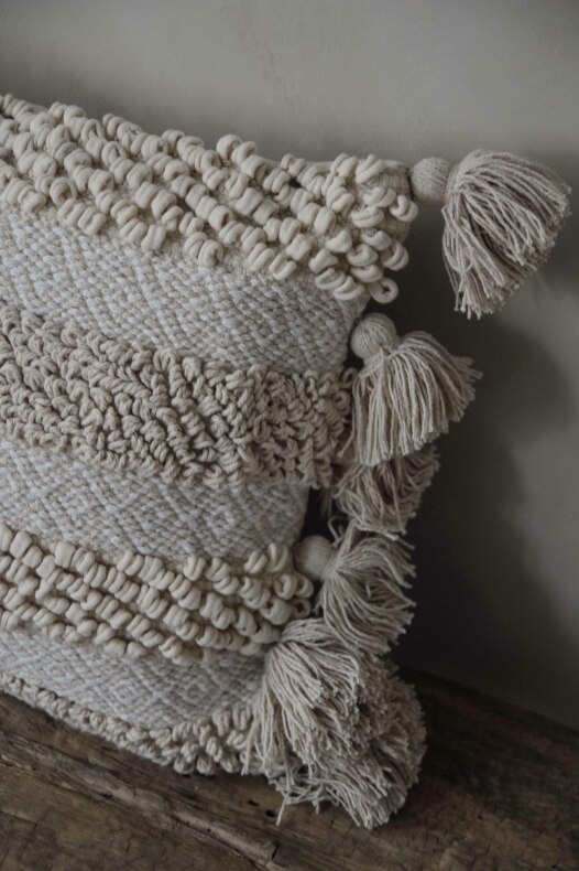 Mysigt kuddfodral Boho från Majas Cottage i grövre bomull. Tofsar på kortsidorna.