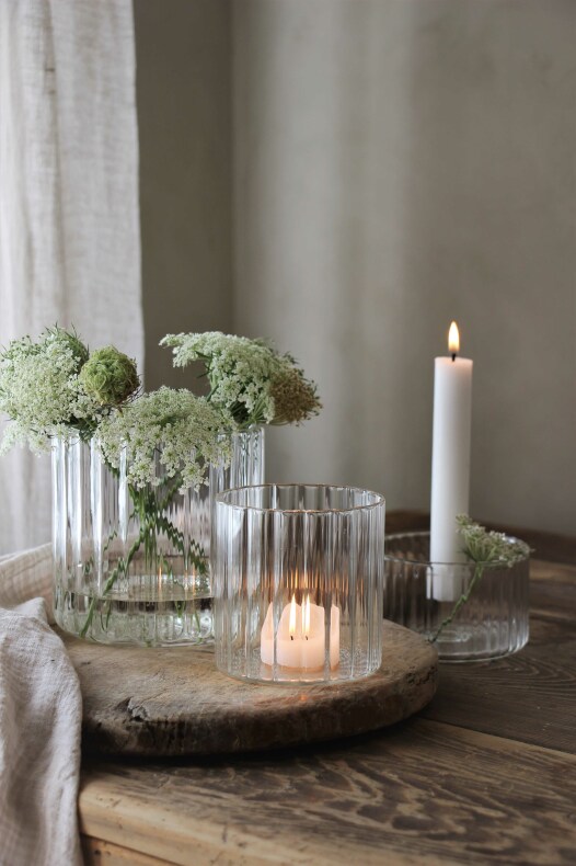 Stilren ljuslykta i räfflat klarglas från Majas Cottage.