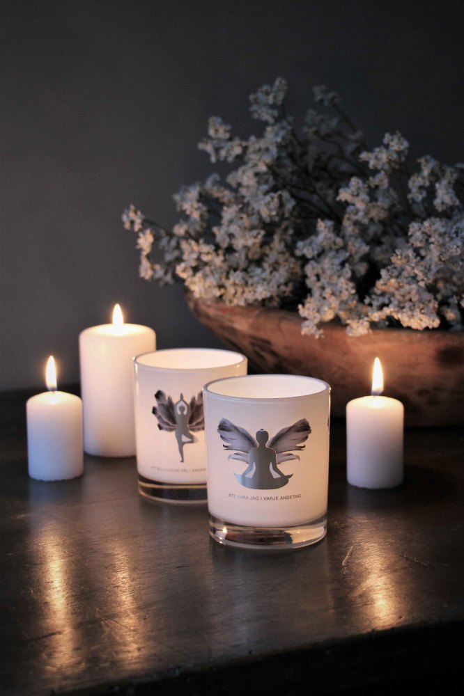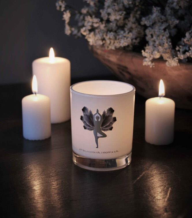 Mysig yoga ljuslykta från Majas Cottage med texten “Att balansera väl i kropp & själ”.