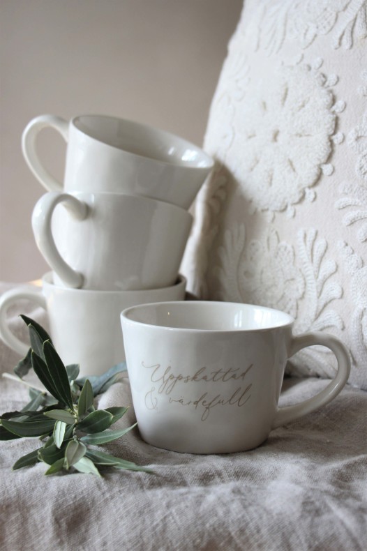 Vacker mugg med texten ”Uppskattad & värdefull”. Tål diskmaskin och micro. Vi rekommenderar handdisk då textdekal alltid har en tendens att slitas.
