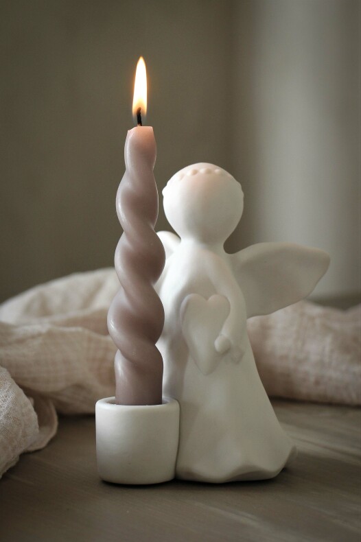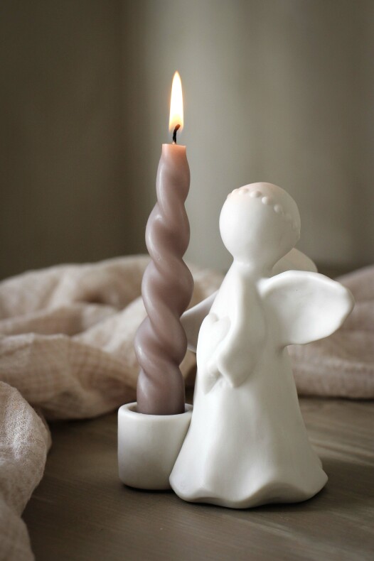 Mysig skyddsängel ljusstake från Majas Cottage i vit keramik som säljs med förmån till Barncancerfonden
