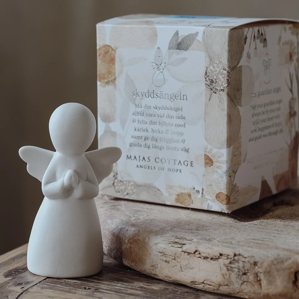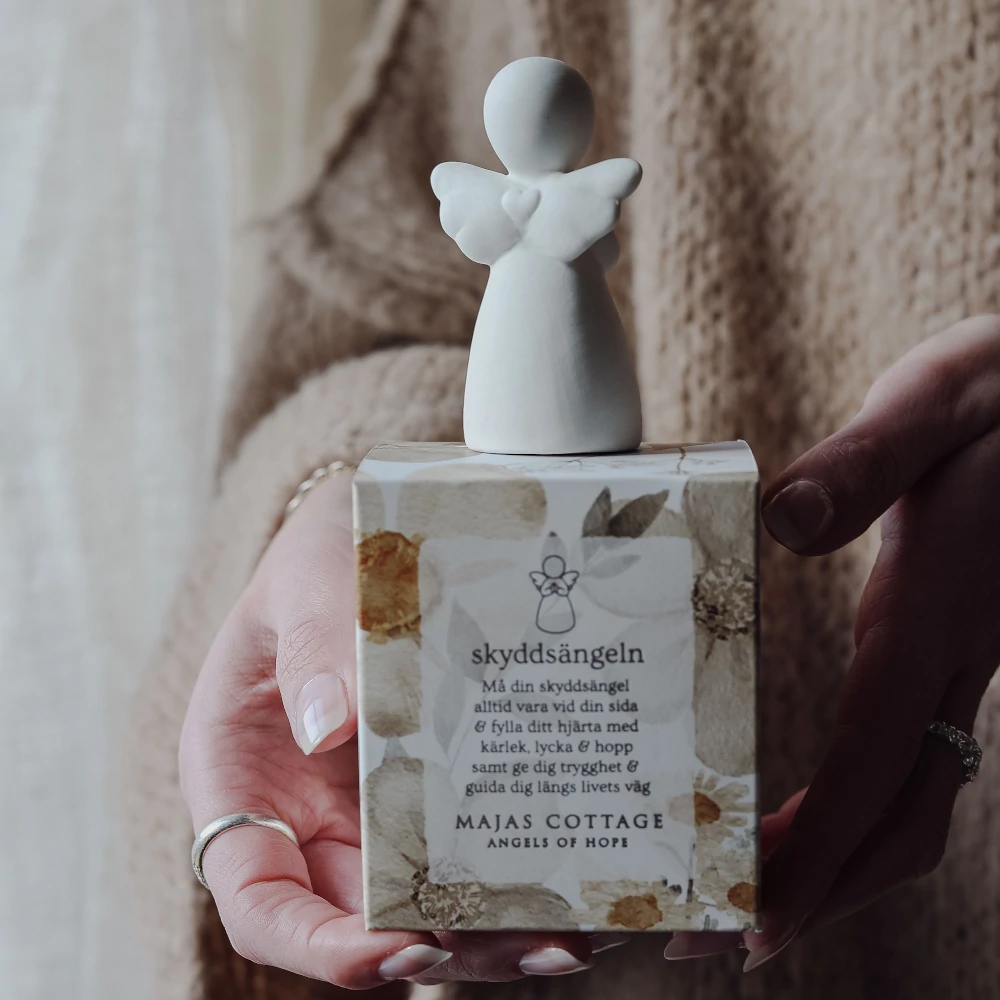 Majas Cottage skyddsängel med tillhörande gåvobox. Gåvoboxens text ”Skyddsängeln .Må din skyddsängel alltid vara vid din sida & fylla ditt hjärta med kärlek, lycka & hopp samt ge dig trygghet & guida dig längs livets väg.”