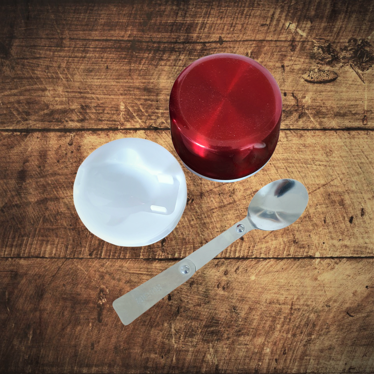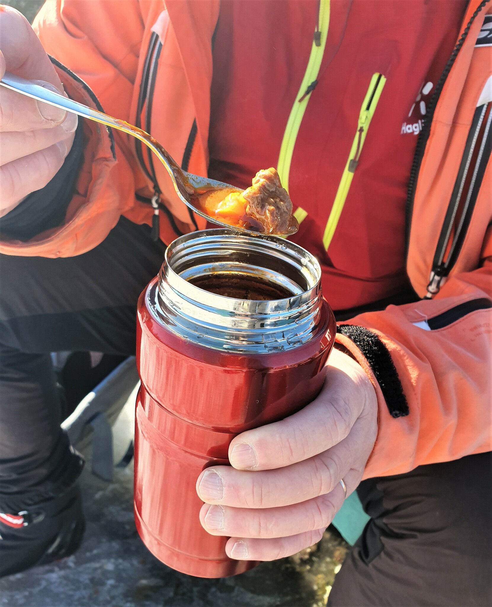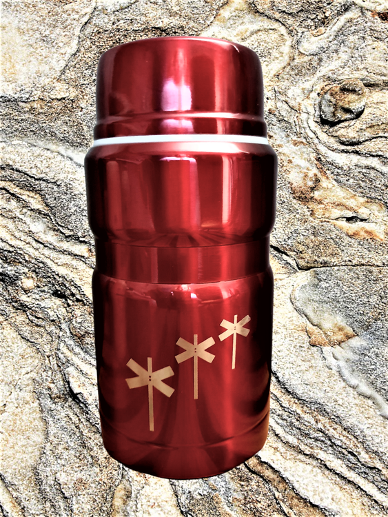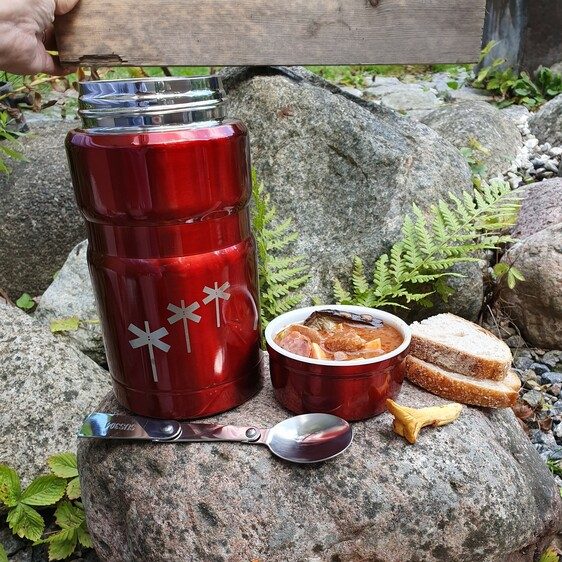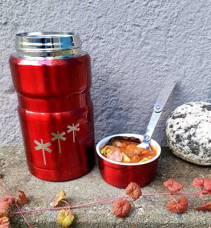 Trött på torra mackor? Skaffa dig en mattermos med ledkryss i lasergravyr. Fyll den med soppa, varmkorv eller annat gott. Smart ihopvikbar sked medföljer i locket.
