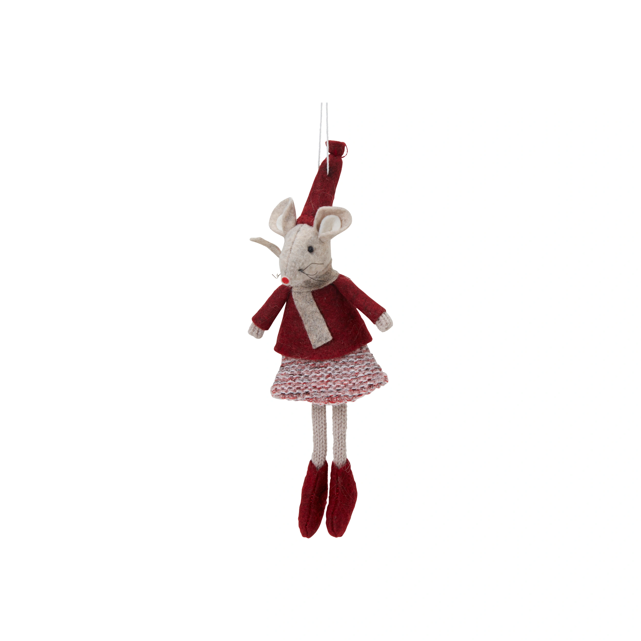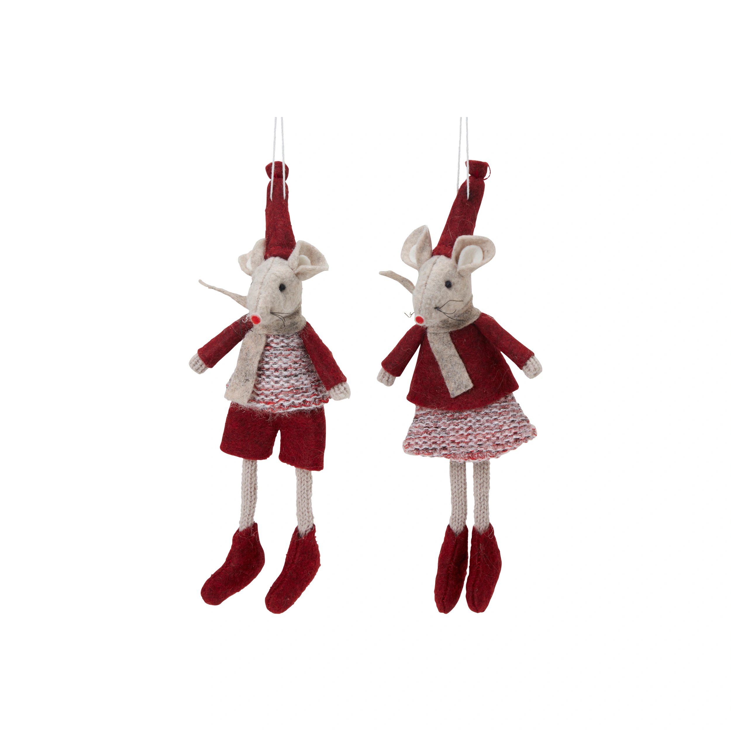 Söta små möss i vinröda kläder. Går att hänga i julgranen då de har hänge. Säljs i 2-pack.