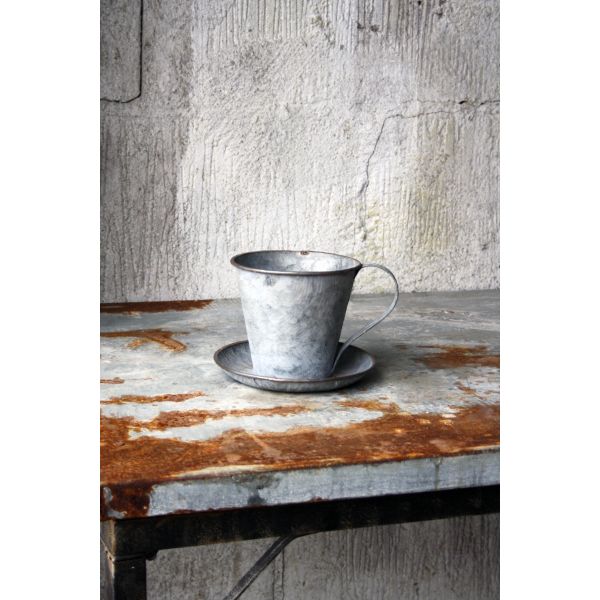 Härlig planteringskopp med fast fat att använda som kruka eller dekoration i zink.
