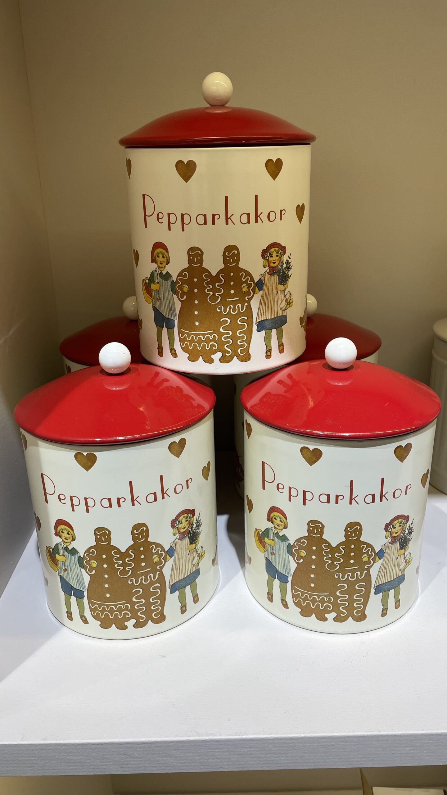 Gammaldags jul plåtburk i vitt / rött med texten Pepparkakor i nostalgisk anda. Avtagbart lock med knopp. Fyll med pepparkakor eller annat gott och du har en perfekt gå-bort-present i juletid. Silikonringen i locket gör att burken blir tätt försluten.