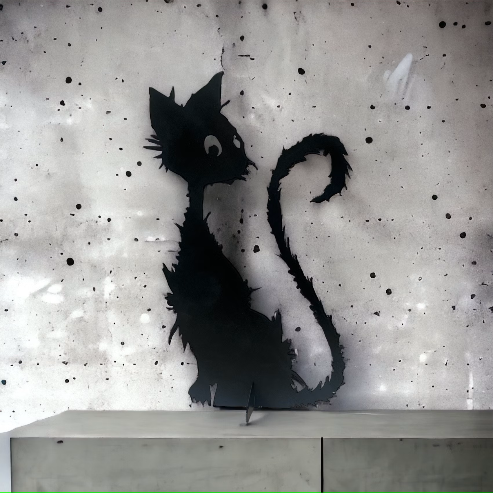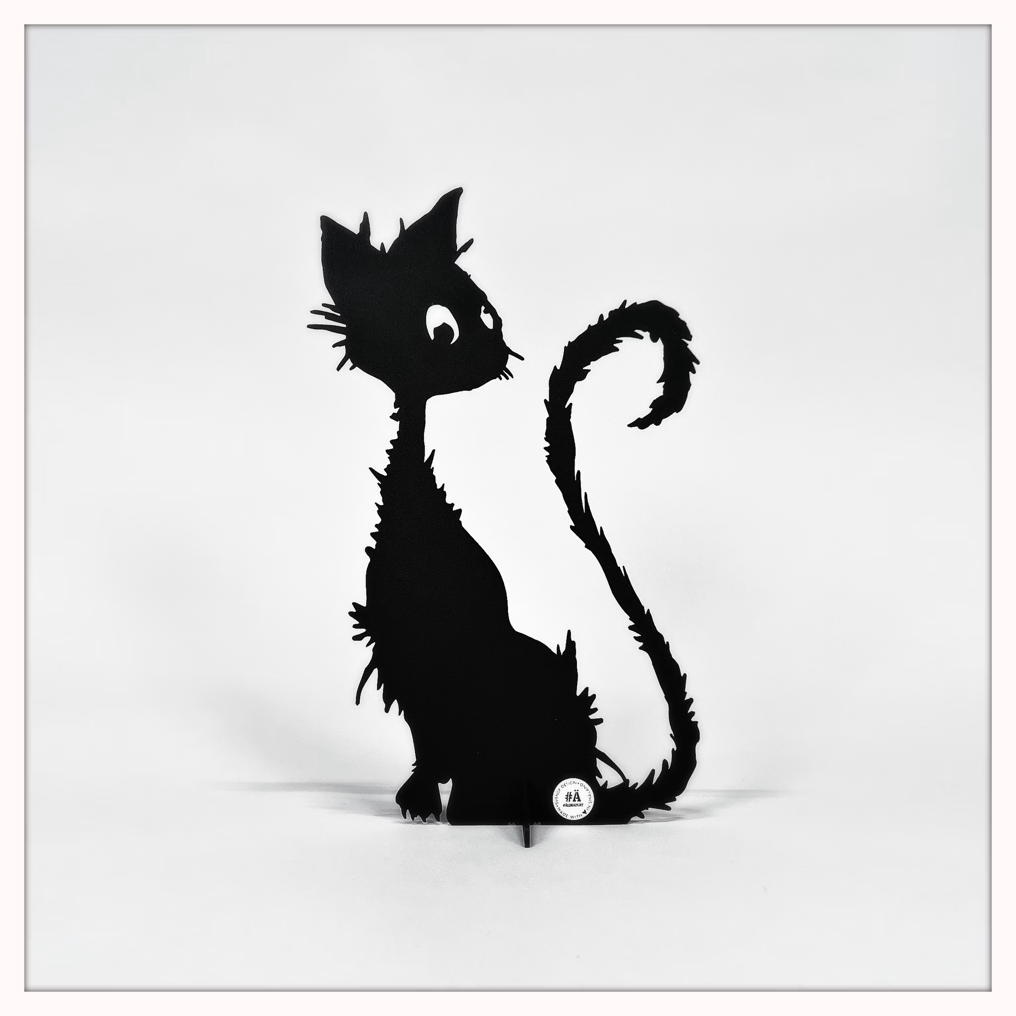 Skylt gjord i svart plåt med motivet av en katt. Monteras enkelt ihop med ett litet stativ så den kan stå stadigt. Passar både för inom- och utomhusbruk.