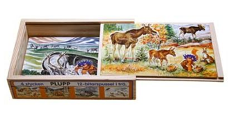 En fin trälåda som innehåller 4 st träpussel på 12 bitar vardera, med motiv ur Inga Borgs fantastiska berättelser om Plupp. En perfekt julklapp till dem minsta!
