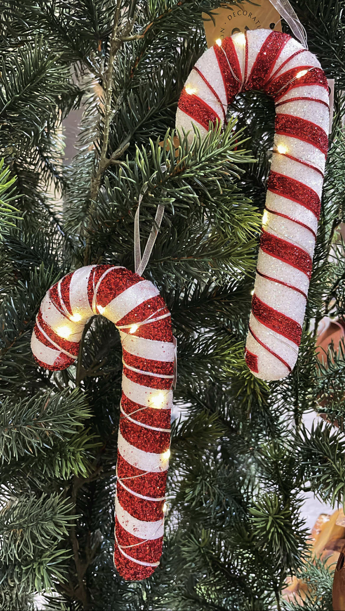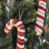 Så fin juldekoration i form av en polkagris i vitt / rött med ränder. Polkagrisen har en inbyggd ljusslinga med LED belysning, 8 lampor. Polkagrisen drivs av 2 st Batterier, CR2032 som ingår.