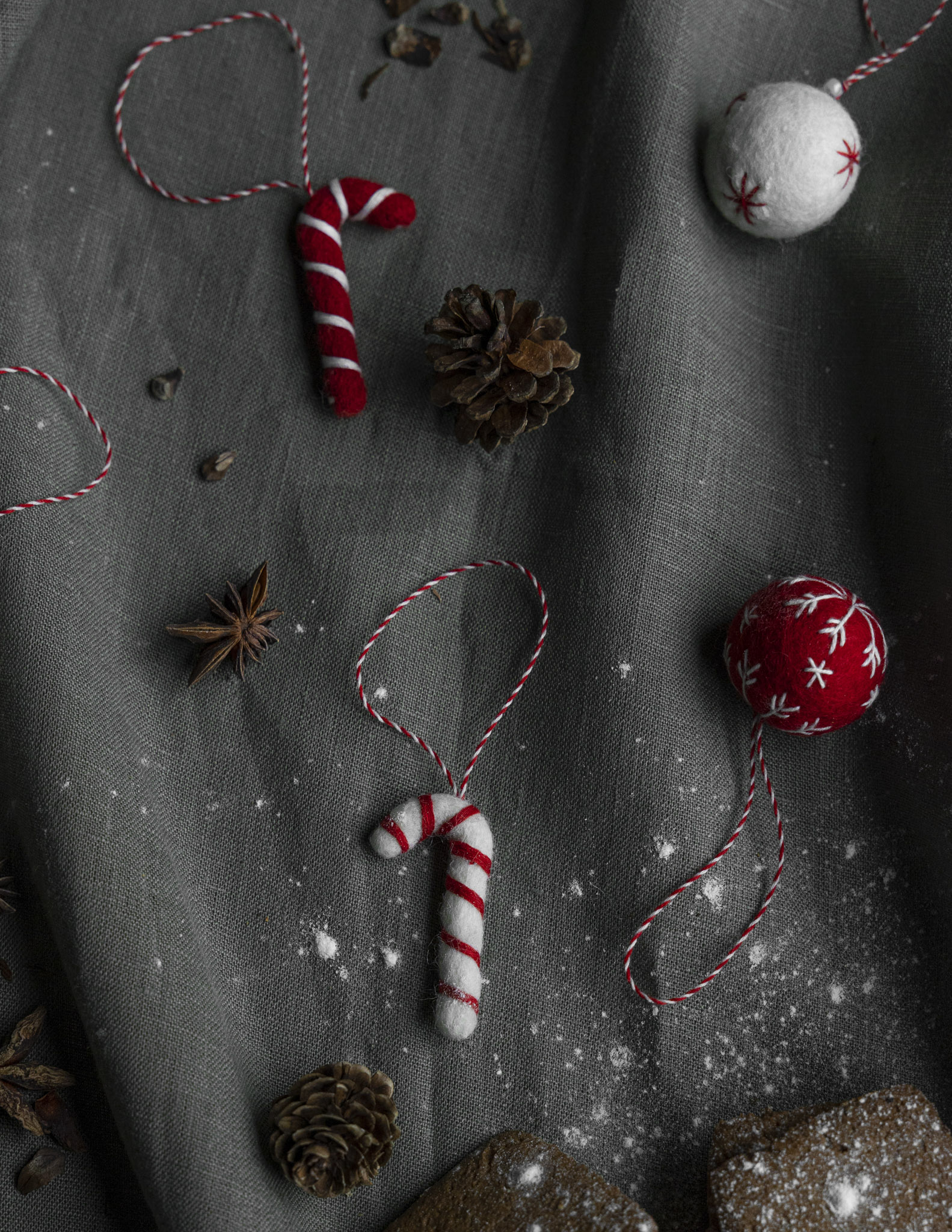 Dekorativa polkagrisar i ull med hänge. Passar perfekt som julgranspynt eller på ett paket. Eller varför inte som servettring?