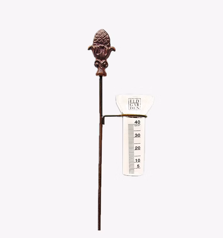 Dekorativ regnmätare med en älva i rostig metall. Delbar stav, regnmätaren är i riktigt glas.