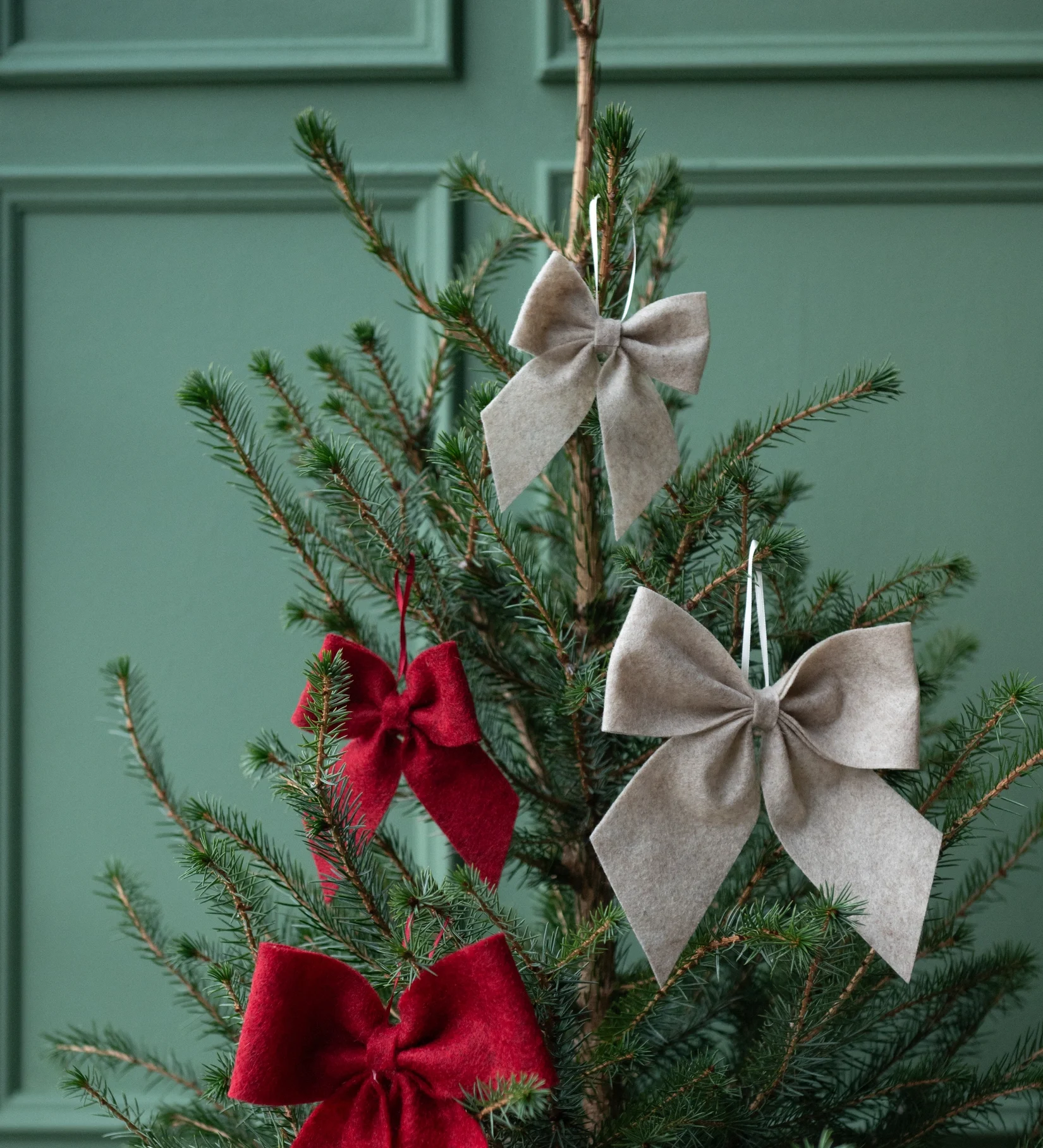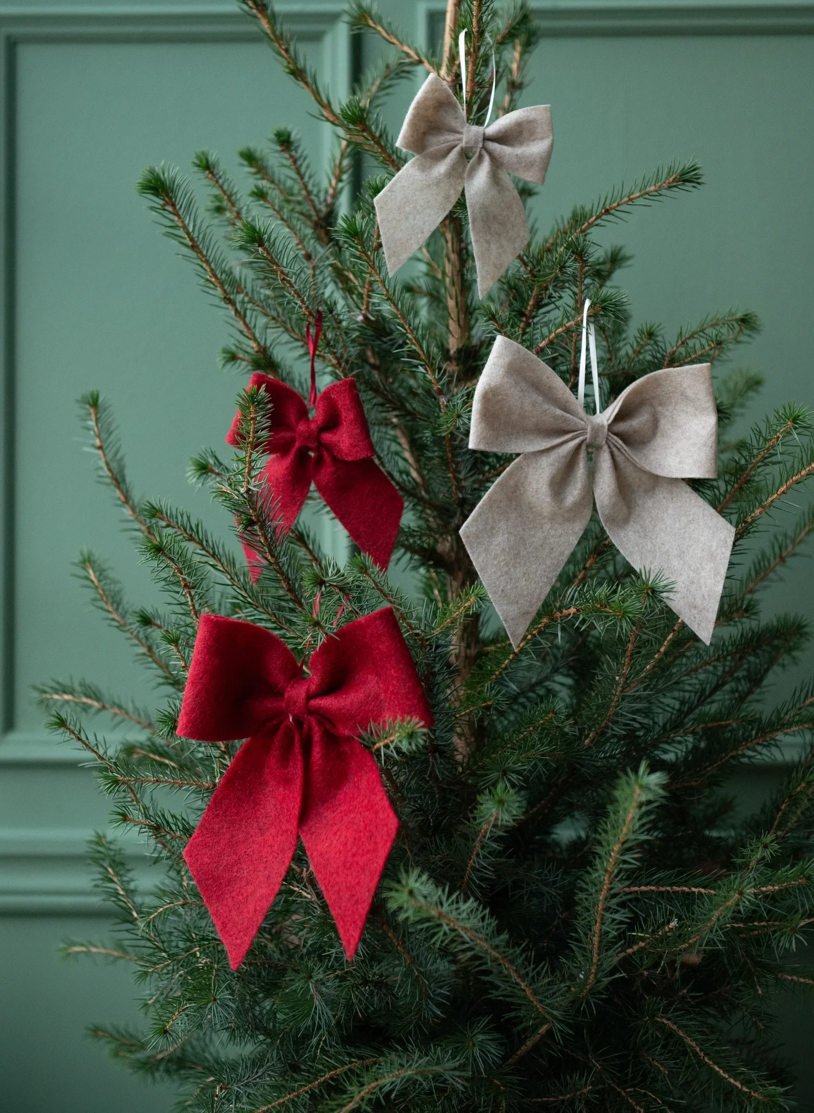 Fin rosett i textil med hänge. En juldekoration som passar perfekt att hänga i julgranen, på ett skåp etc.