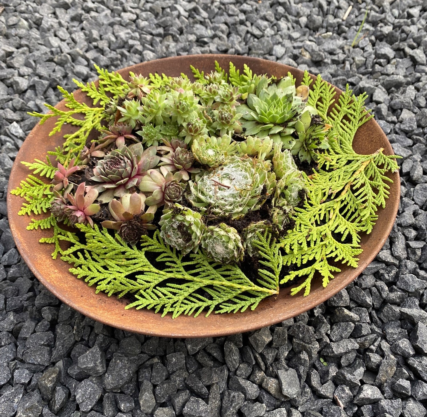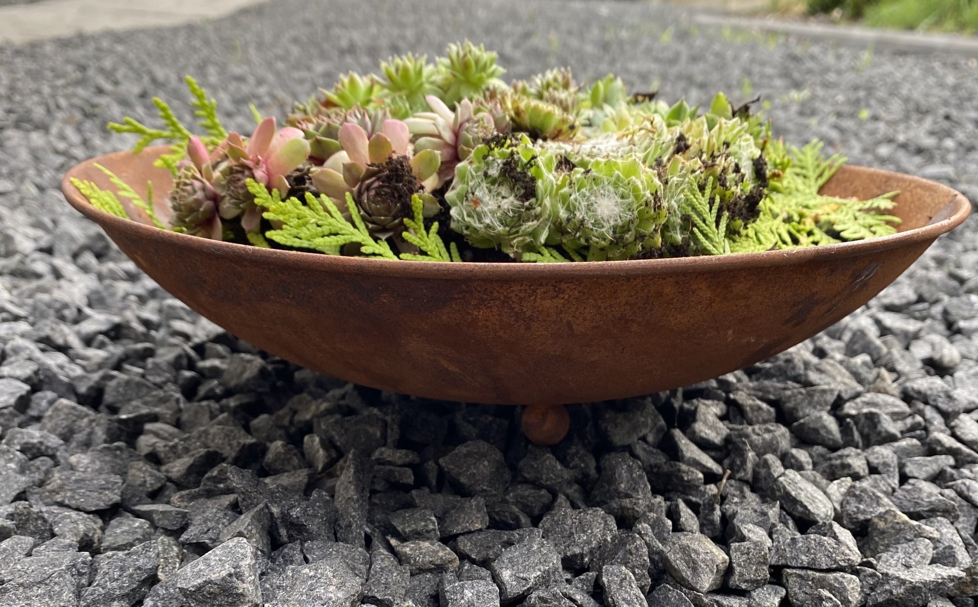 Enkelt fat / kruka på små kulfötter i rostigt järn. Passar lika bra att plantera i som använda till fågelbad.