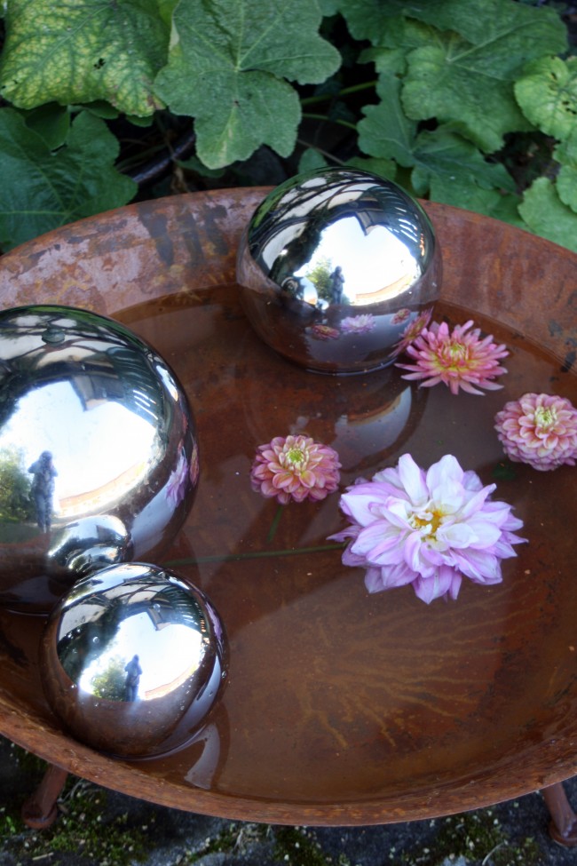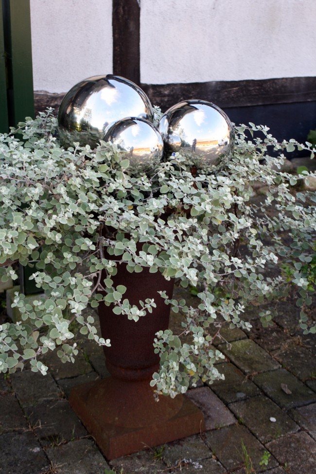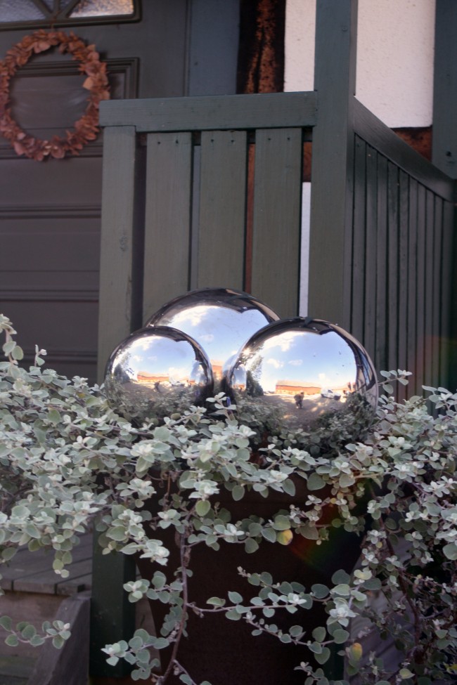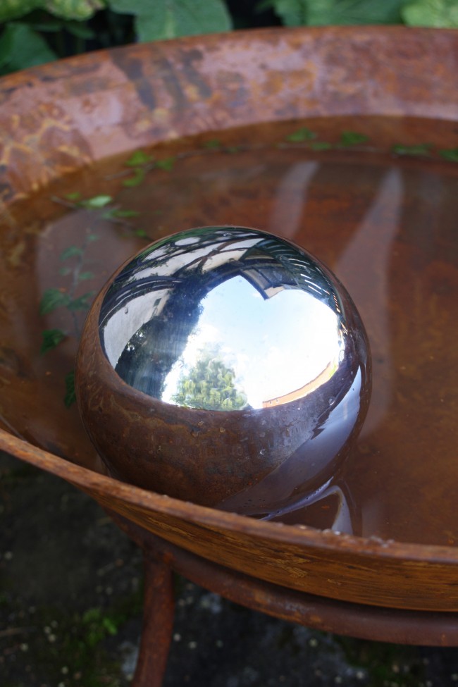 Dekorativt silverklot i rostfritt stål. Lika fina att dekorera med i rabatten som på uteplatsen eller i en kruka. Dem är även flytande och kan därför med fördel placeras i en damm, i ett fågelbad eller i våra vackra eldfat.