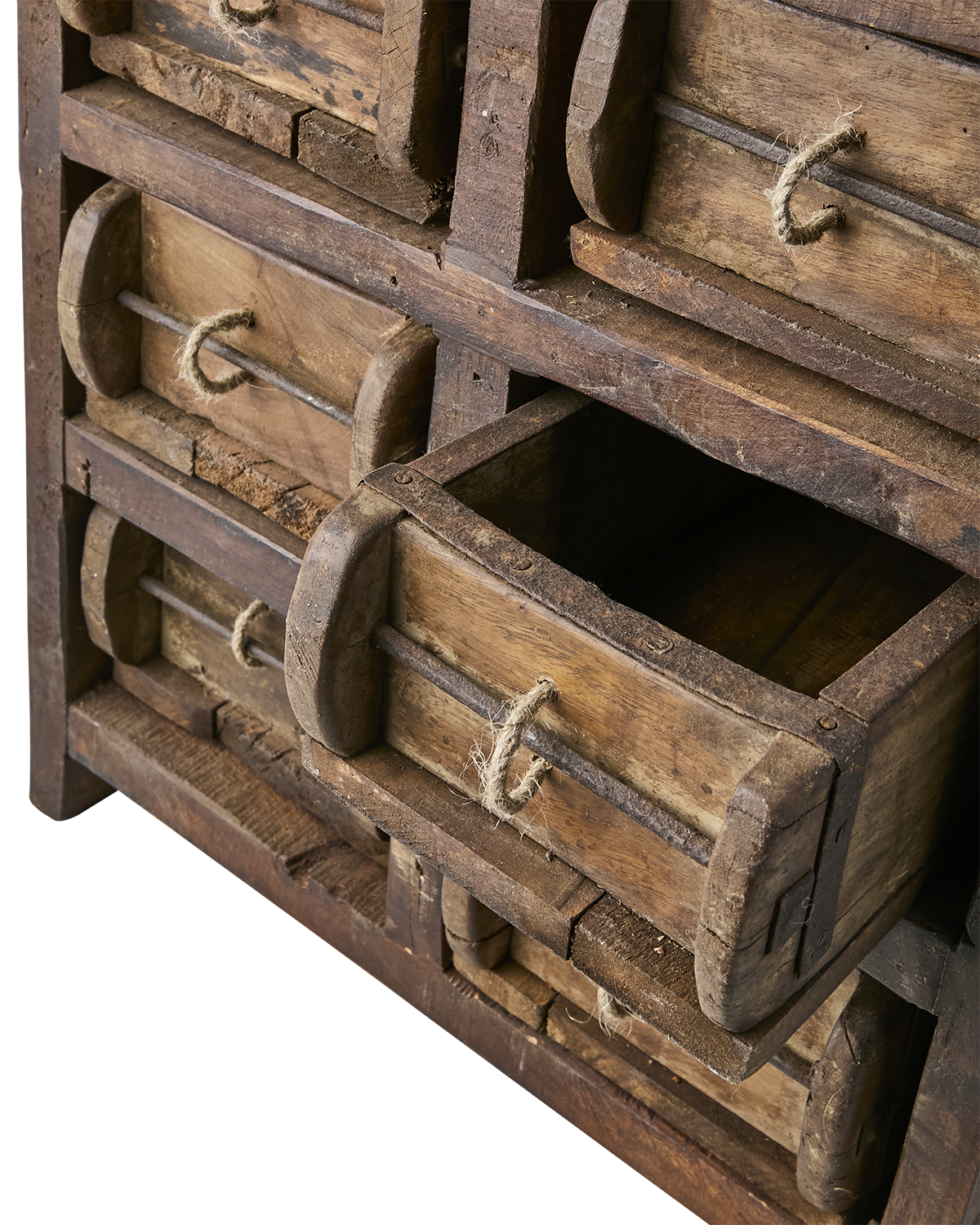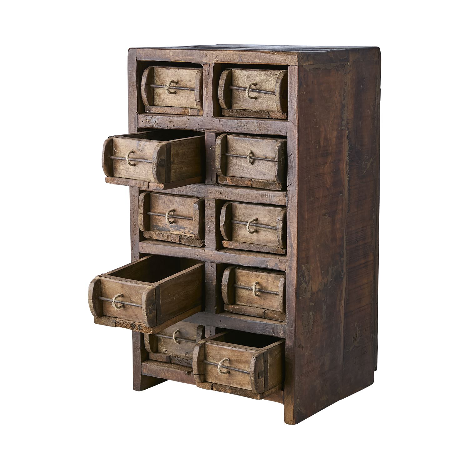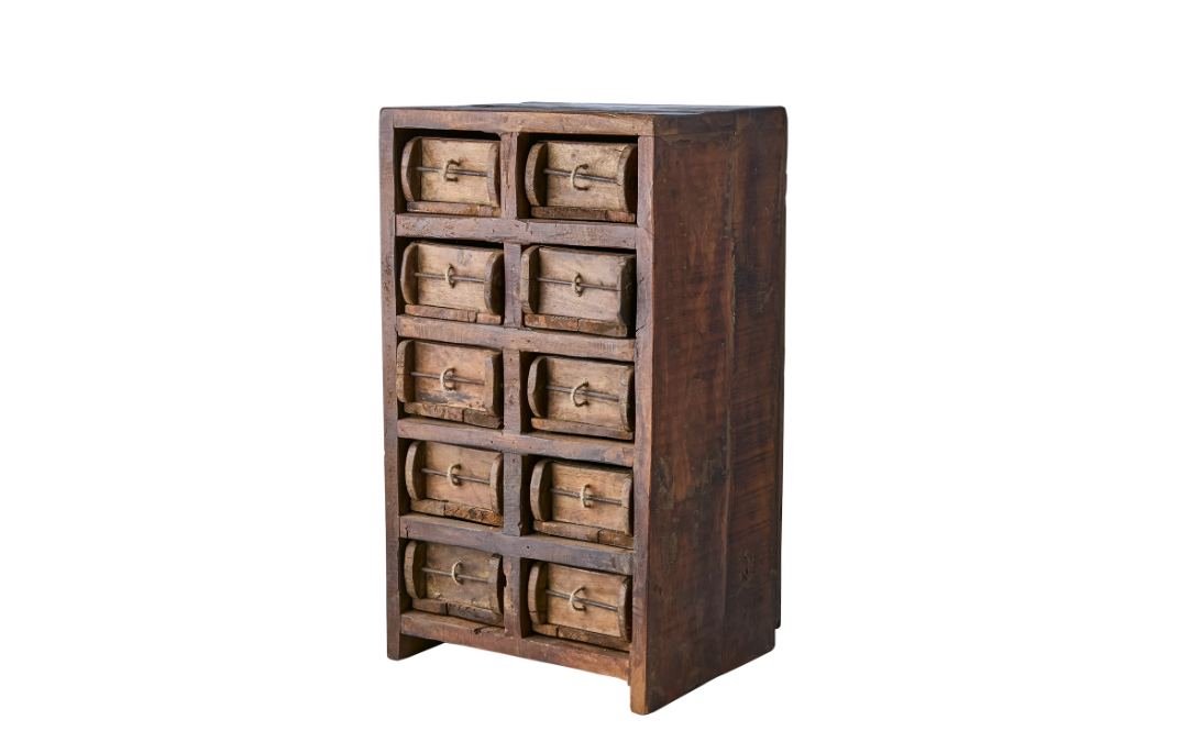 Gammalt skåp / lådhurts i natur är en unik förvaringsmöbel tillverkad av gamla tegelstensformar i trä. Med sin rustika patina och naturliga variationer i färg och struktur har varje exemplar en genuin vintagekänsla. Den robusta konstruktionen rymmer tio små lådor, perfekta för att organisera och förvara mindre föremål med både stil och funktion. En dekorativ och praktisk liten möbel som passar lika bra i hallen och vardagsrummet som på kontoret.