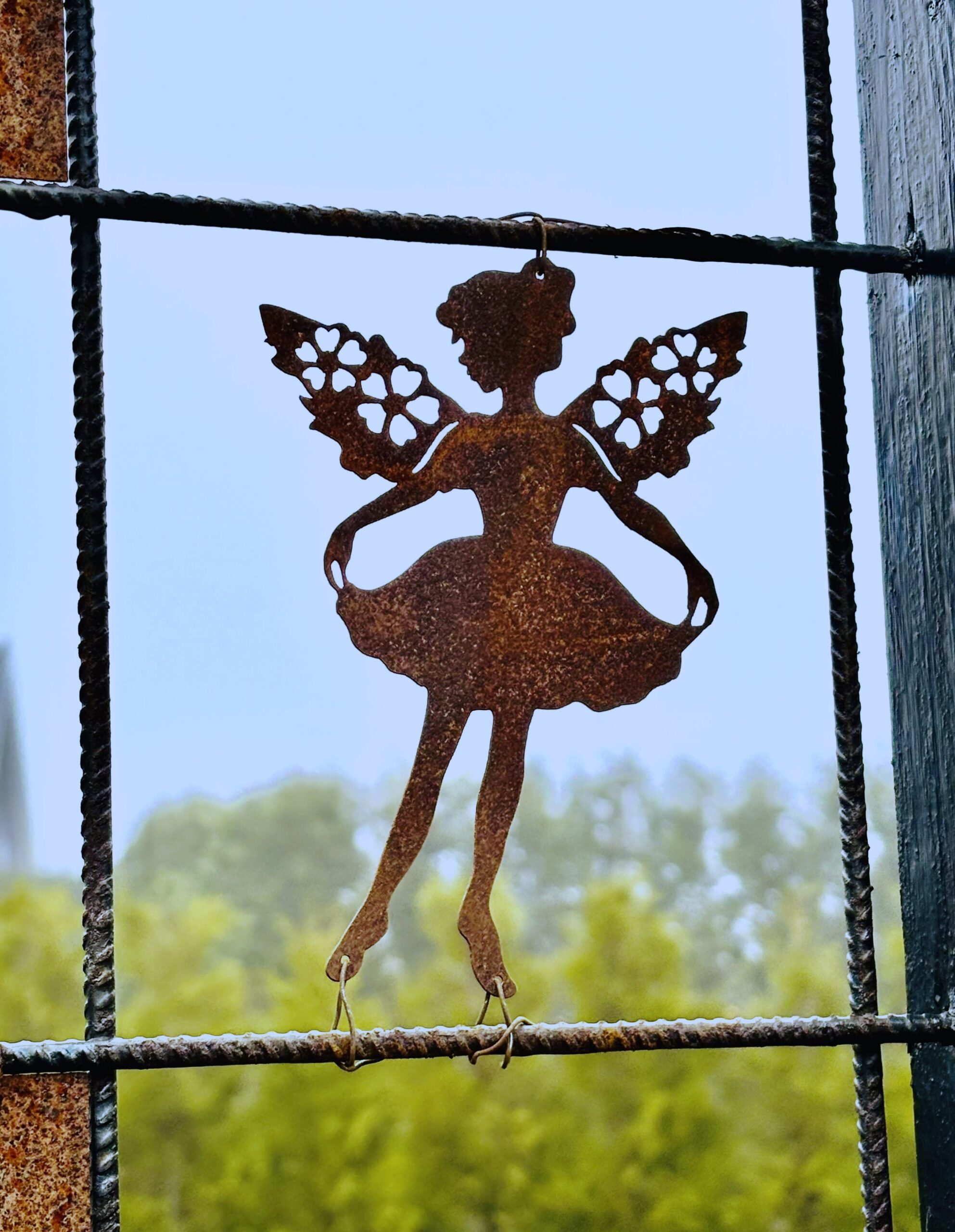 Söt figur i rostig plåt med motivet av en älva. Dessa passar perfekt att fästa i ett armeringsnät men kan även hängas som dekoration på annat sätt i den långa ståltråden som medföljer.