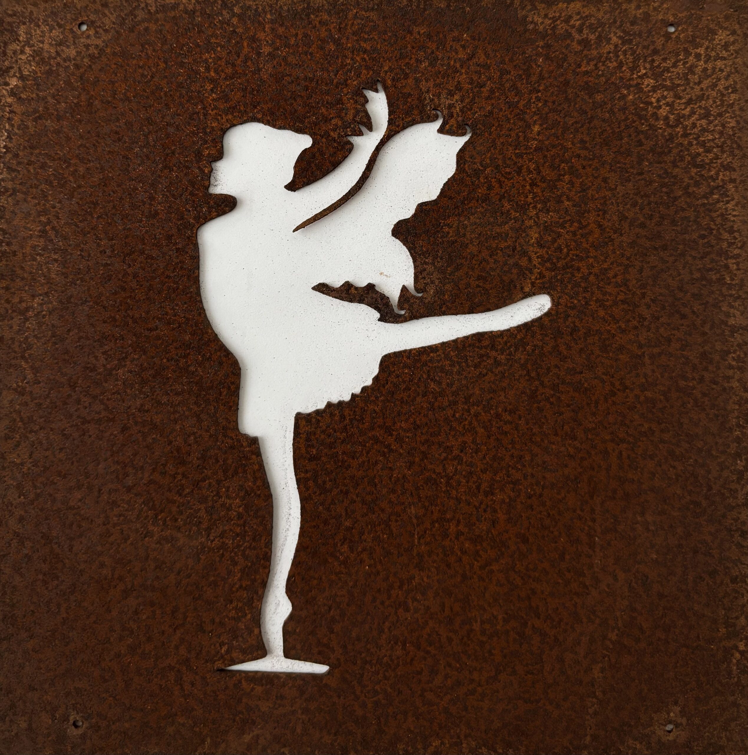 Dekorativ trädgårdsskylt till armeringsnät i rostig plåt med motivet av en ballerinaälva. Dessa passar perfekt att fästa i ett armeringsnät. Rostig ståltråd för upphängning ingår.