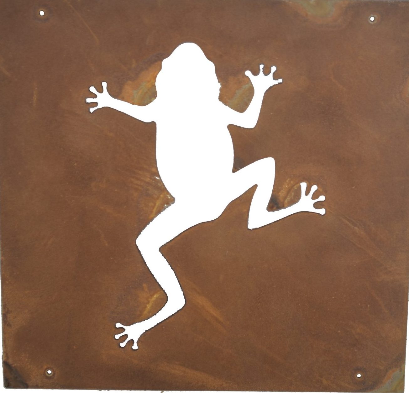 Dekorativ trädgårdsskylt i rostig plåt med motivet av en groda. Dessa passar perfekt att fästa i ett armeringsnät. Rostig ståltråd för upphängning ingår.