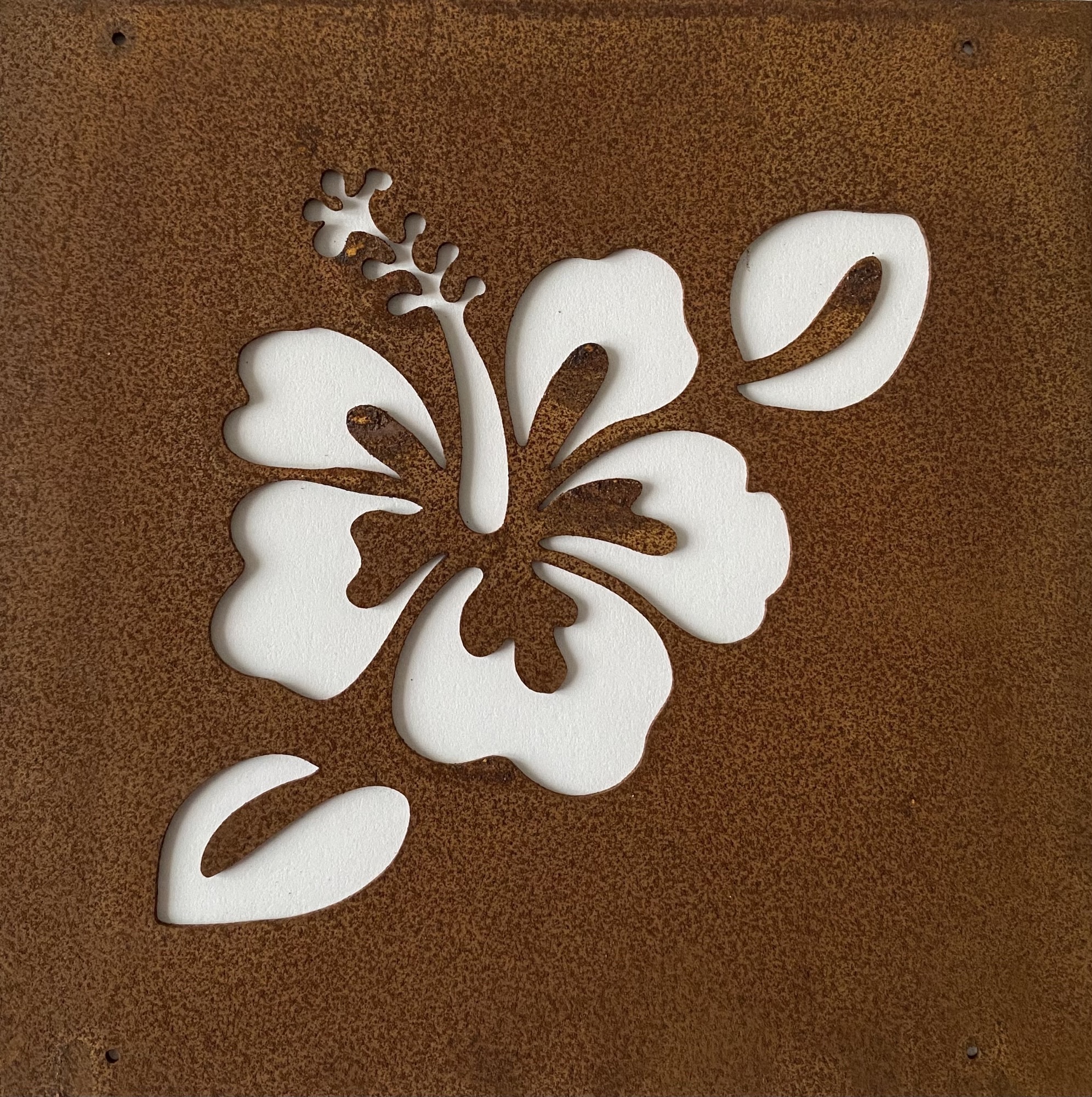 Dekorativ trädgårdsskylt i rostig plåt med motivet av en hibiskus. Dessa passar perfekt att fästa i ett armeringsnät. Rostig ståltråd för upphängning ingår.