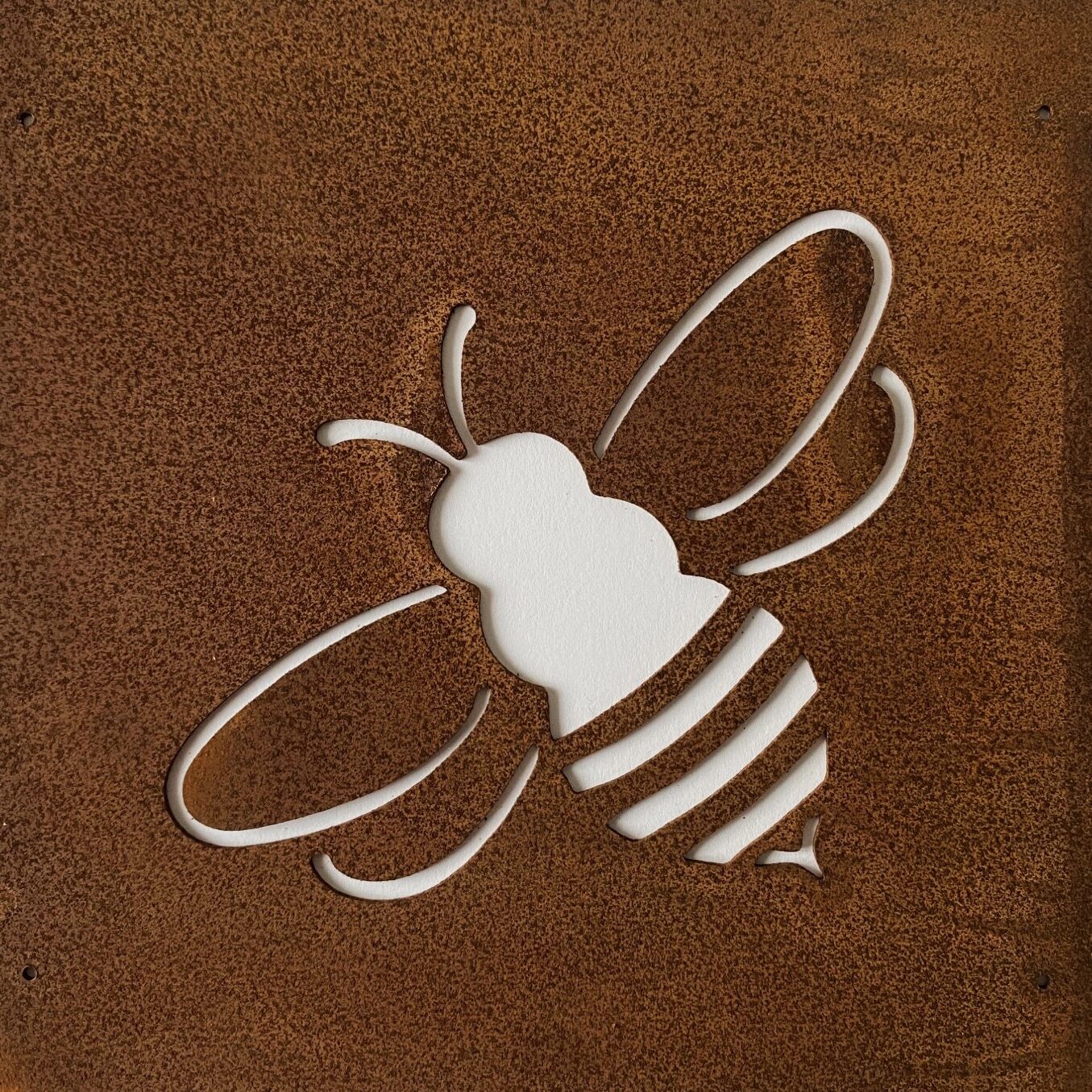 Dekorativ trädgårdsskylt i rostig plåt med motivet av en humla. Dessa passar perfekt att fästa i ett armeringsnät. Rostig ståltråd för upphängning ingår.