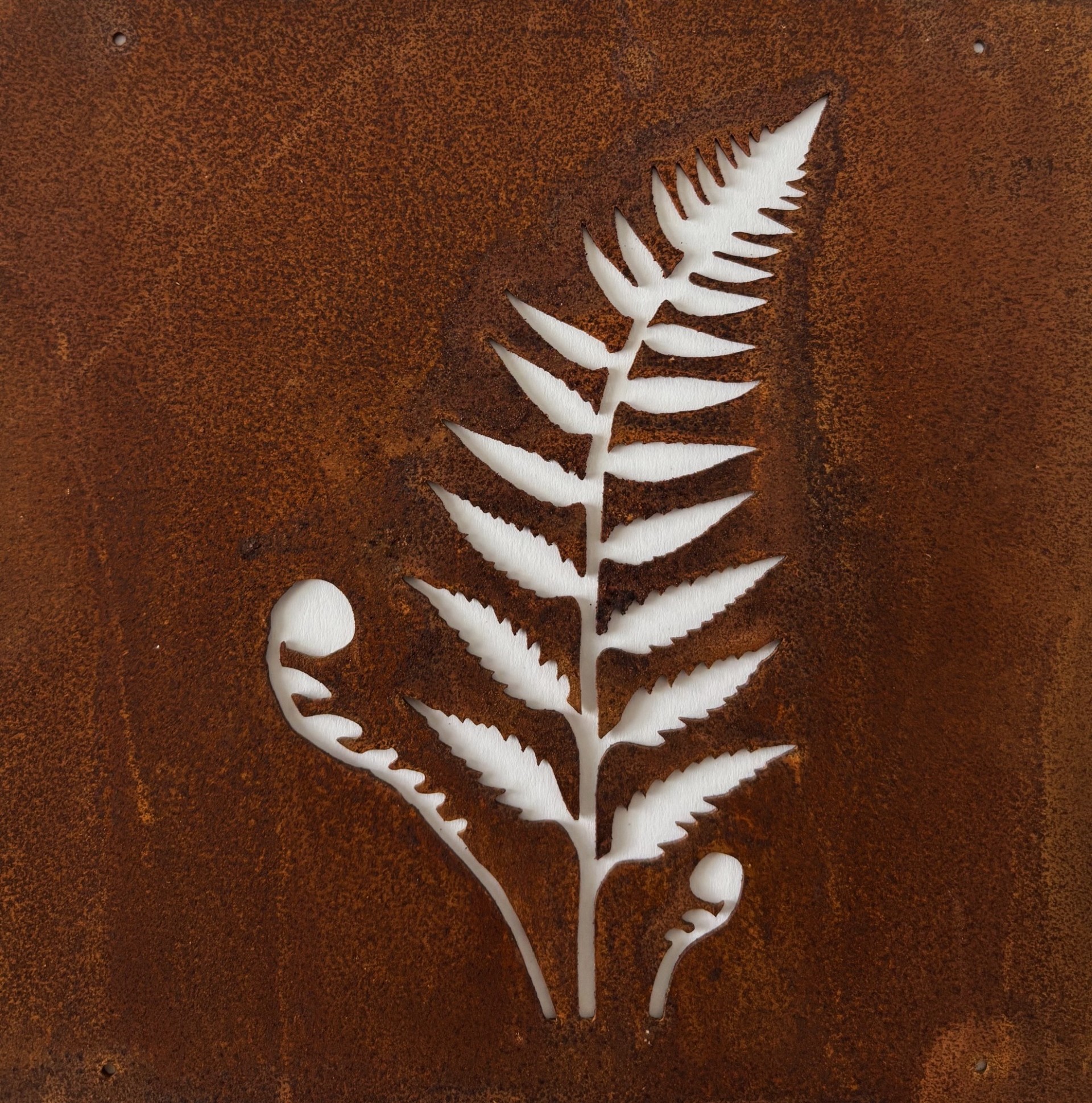 Dekorativ trädgårdsskylt i rostig plåt med motivet av en ormbunke. Dessa passar perfekt att fästa i ett armeringsnät. Rostig ståltråd för upphängning ingår.