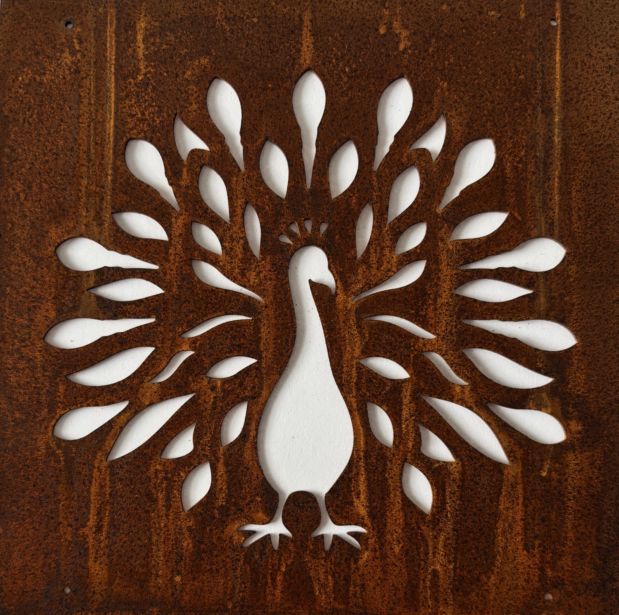 Dekorativ trädgårdsskylt till armeringsnät i rostig plåt med motivet av en påfågel. Dessa passar perfekt att fästa i ett armeringsnät. Rostig ståltråd för upphängning ingår.