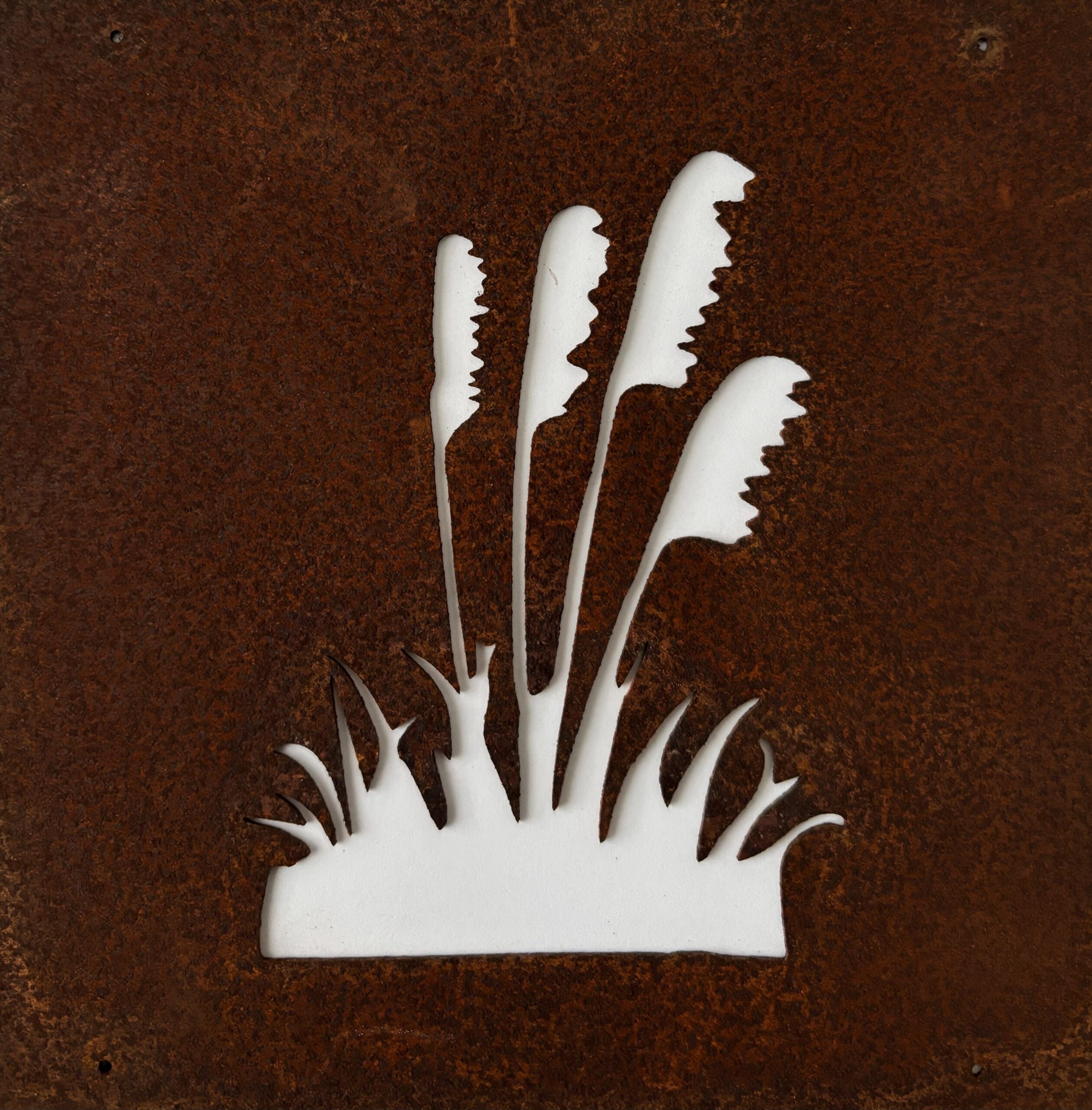 Dekorativ trädgårdsskylt till armeringsnät i rostig plåt med motivet av pampasgräs. Dessa passar perfekt att fästa i ett armeringsnät. Rostig ståltråd för upphängning ingår.