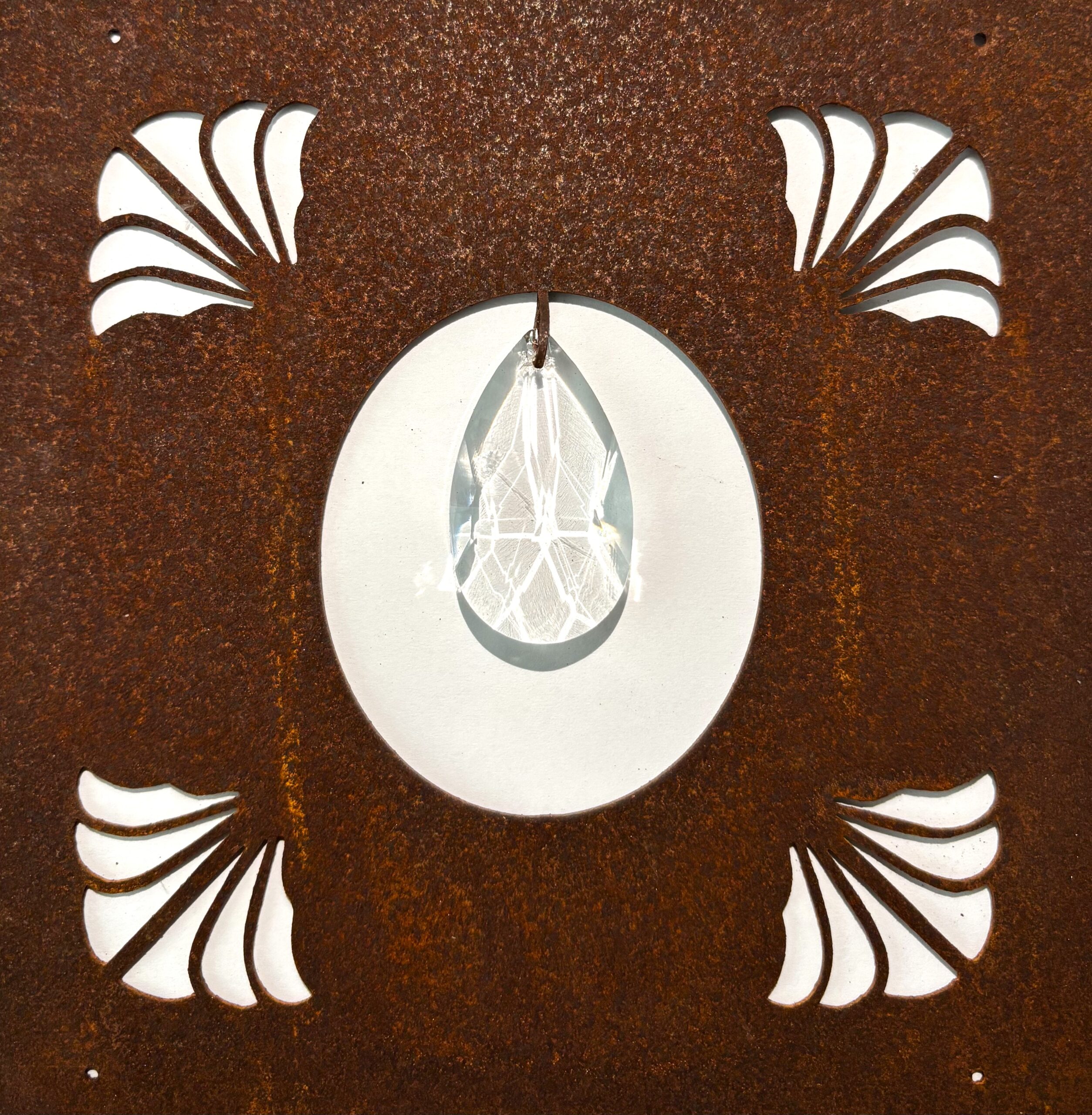 Dekorativ trädgårdsskylt till armeringsnät i rostig plåt med motivet av en snäcka med hängande glasdroppe / prisma. Dessa passar perfekt att fästa i ett armeringsnät. Rostig ståltråd för upphängning ingår.