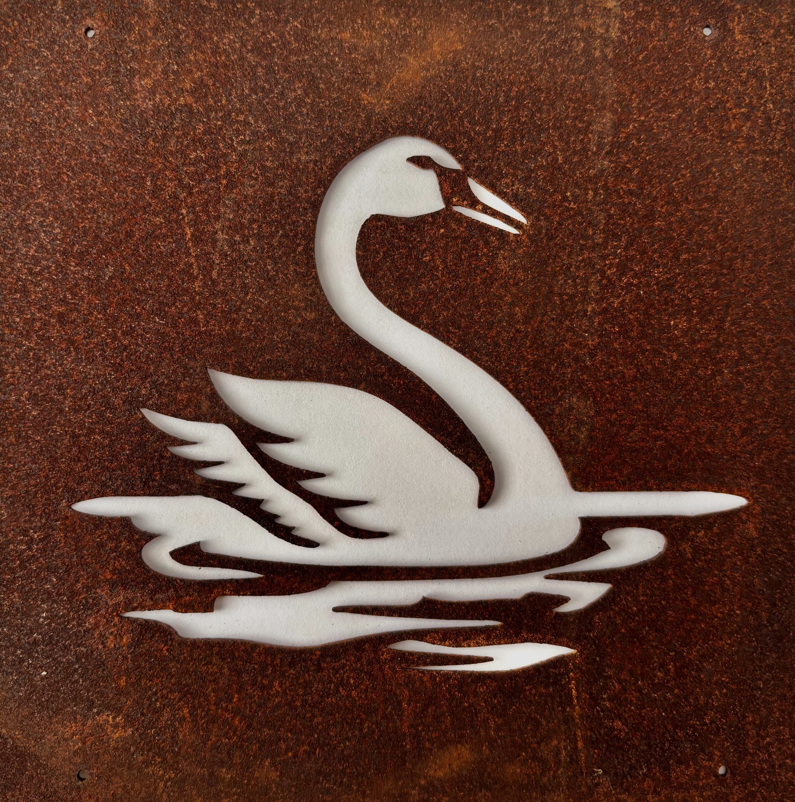 Dekorativ trädgårdsskylt i rostig plåt med motivet av en svan. Dessa passar perfekt att fästa i ett armeringsnät. Rostig ståltråd för upphängning ingår.