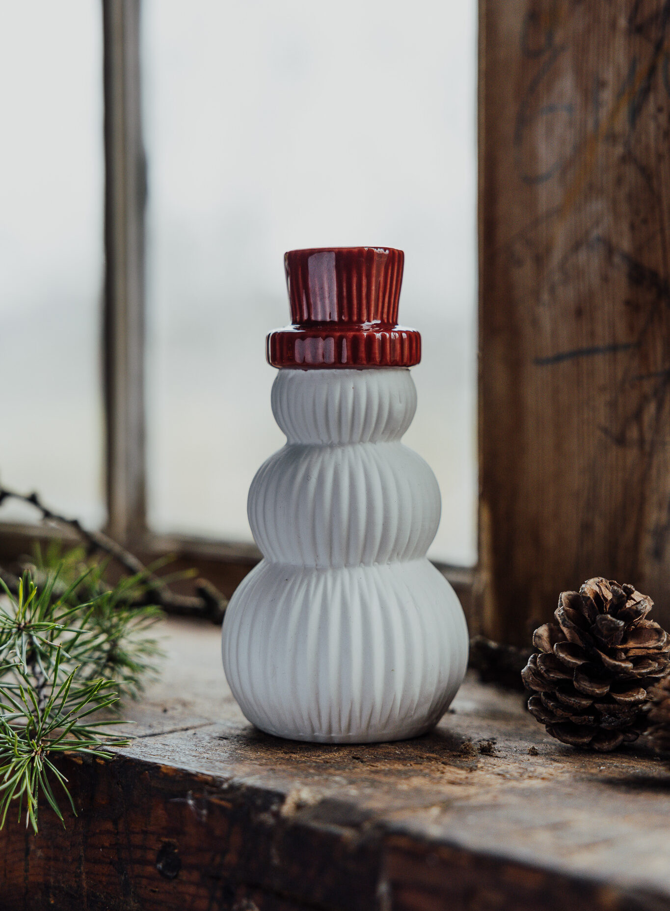 Snögubbe juldekoration i vit matt keramik. Snögubben har en glaserad röd hatt på huvudet.. Fin i sin enkelhet men passar också bra tillsammans med våra andra juldekorationer.