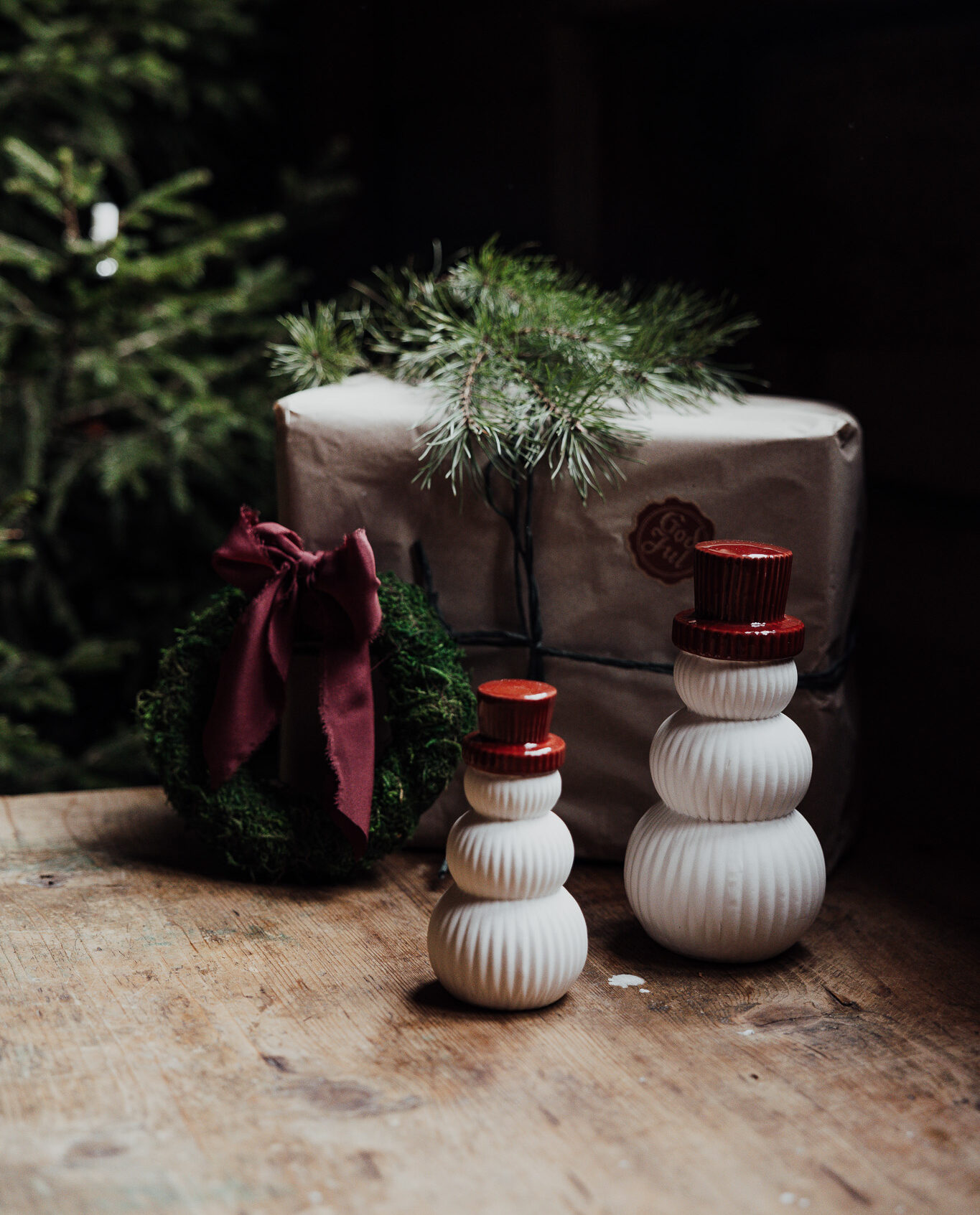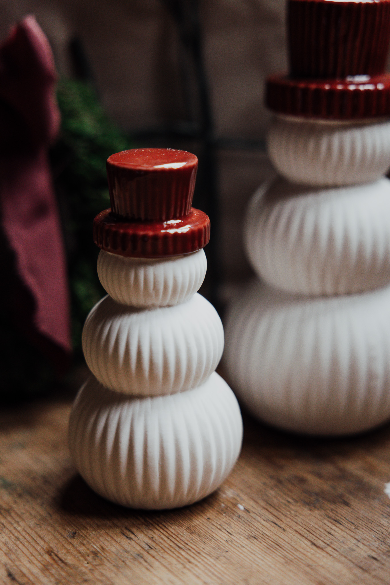 Snögubbe juldekoration i vit matt keramik. Snögubben har en glaserad röd hatt på huvudet.. Fin i sin enkelhet men passar också bra tillsammans med våra andra juldekorationer.