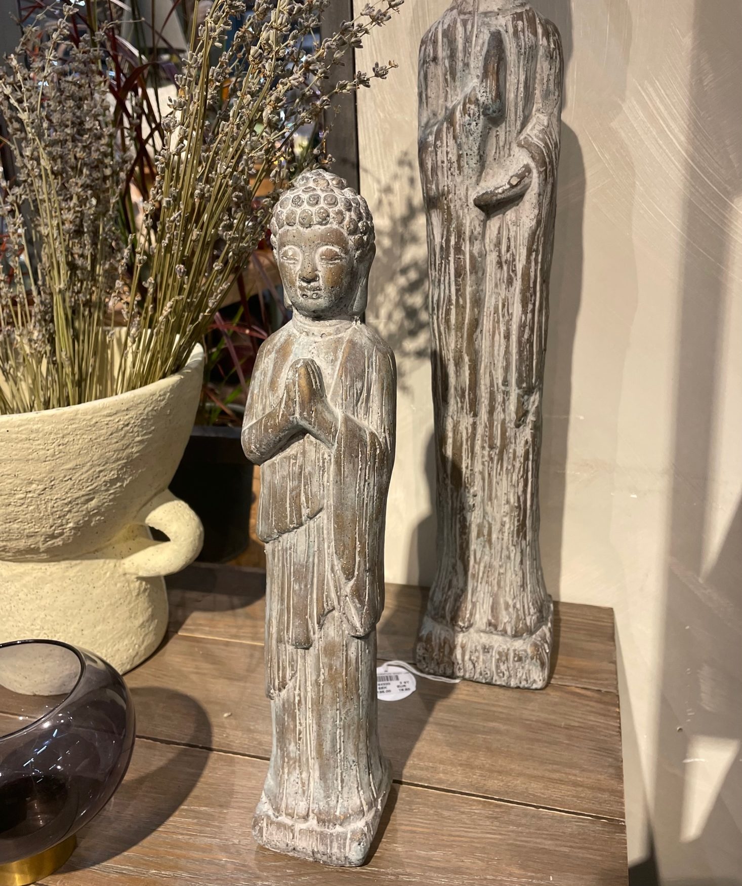 Vacker stående Buddha staty med en brun/grå finish med skiftningar för att se gammal och sliten ut.