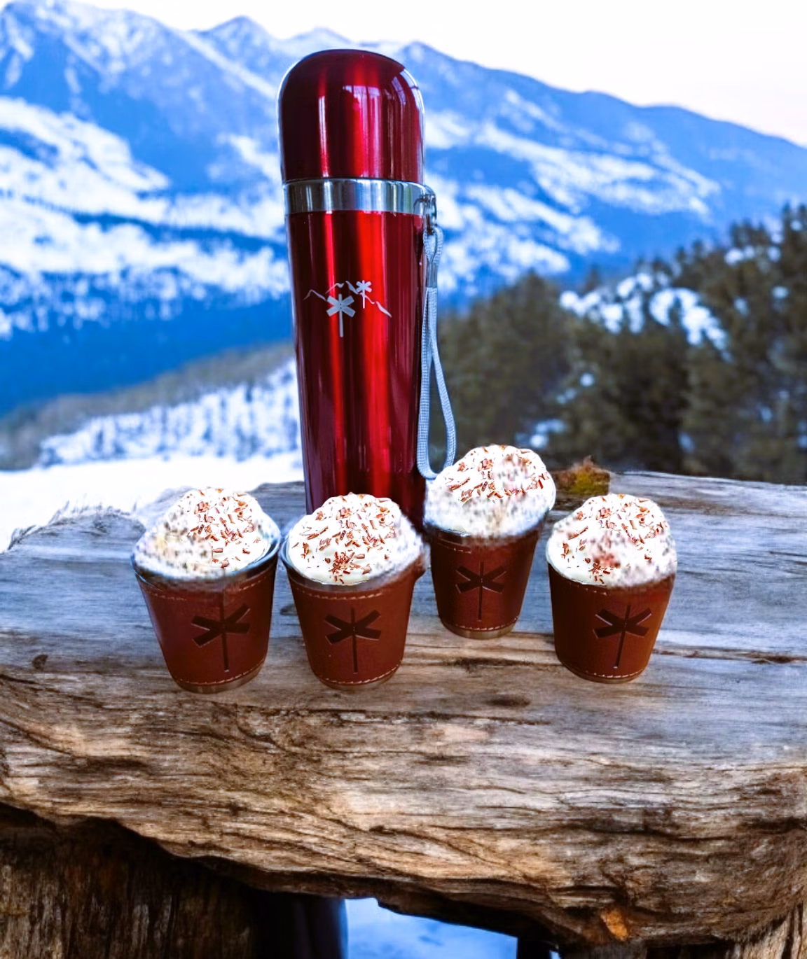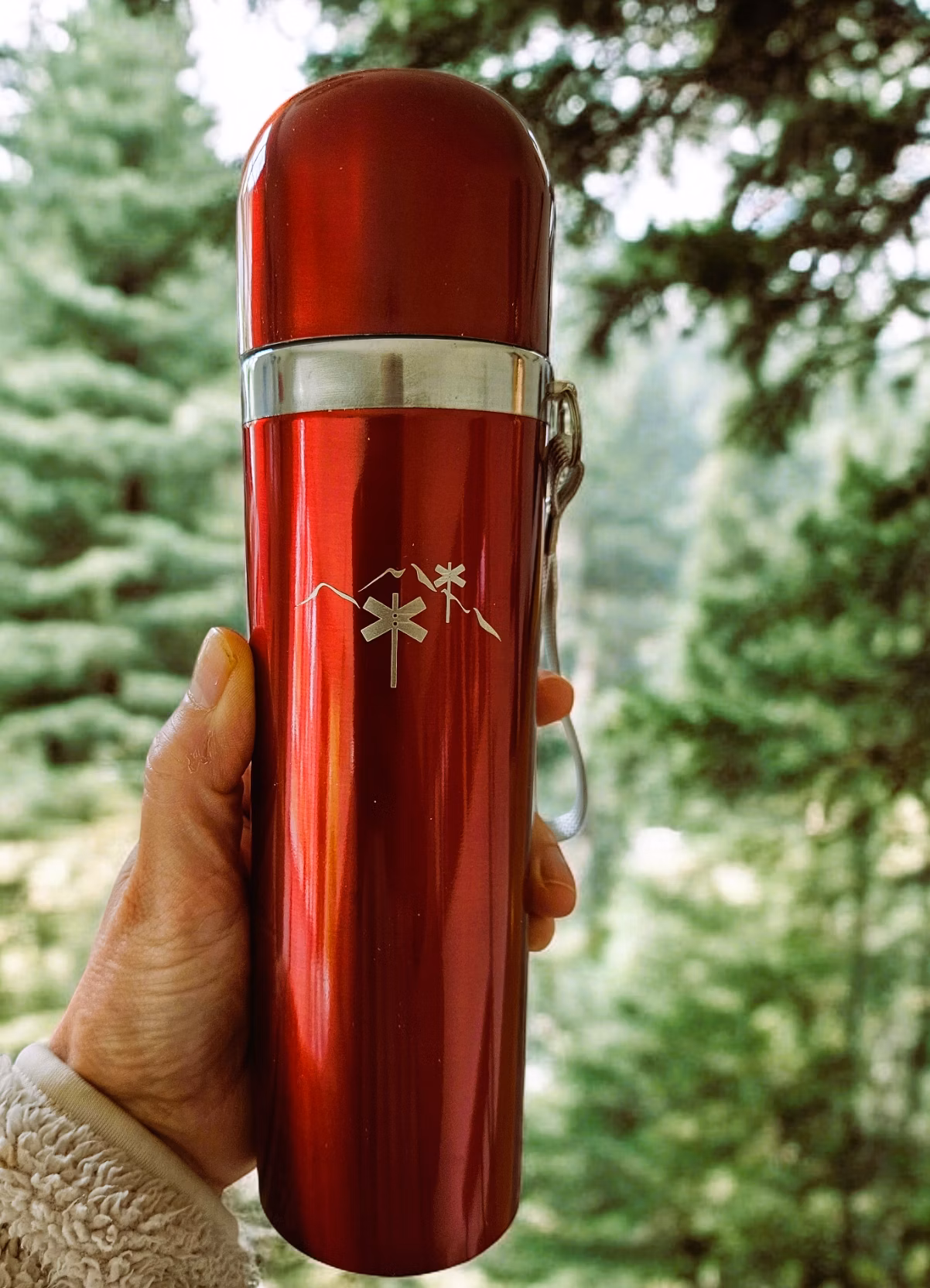 Röd termos med ledkryss och fjäll i lasergravyr. Ett måste till fjällälskaren eller stugan.