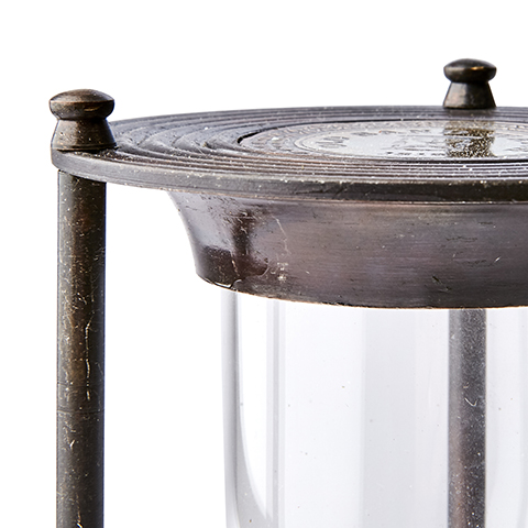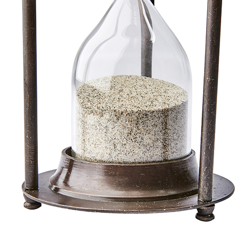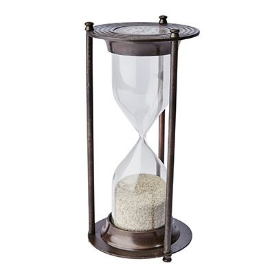 Tidlöst timglas i antikbehandlad mässing. Ljus sand som rinner i 6 minuter.