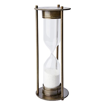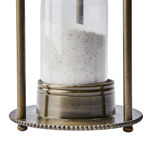 Tidlöst timglas i antikbehandlad mässing med vit sand.