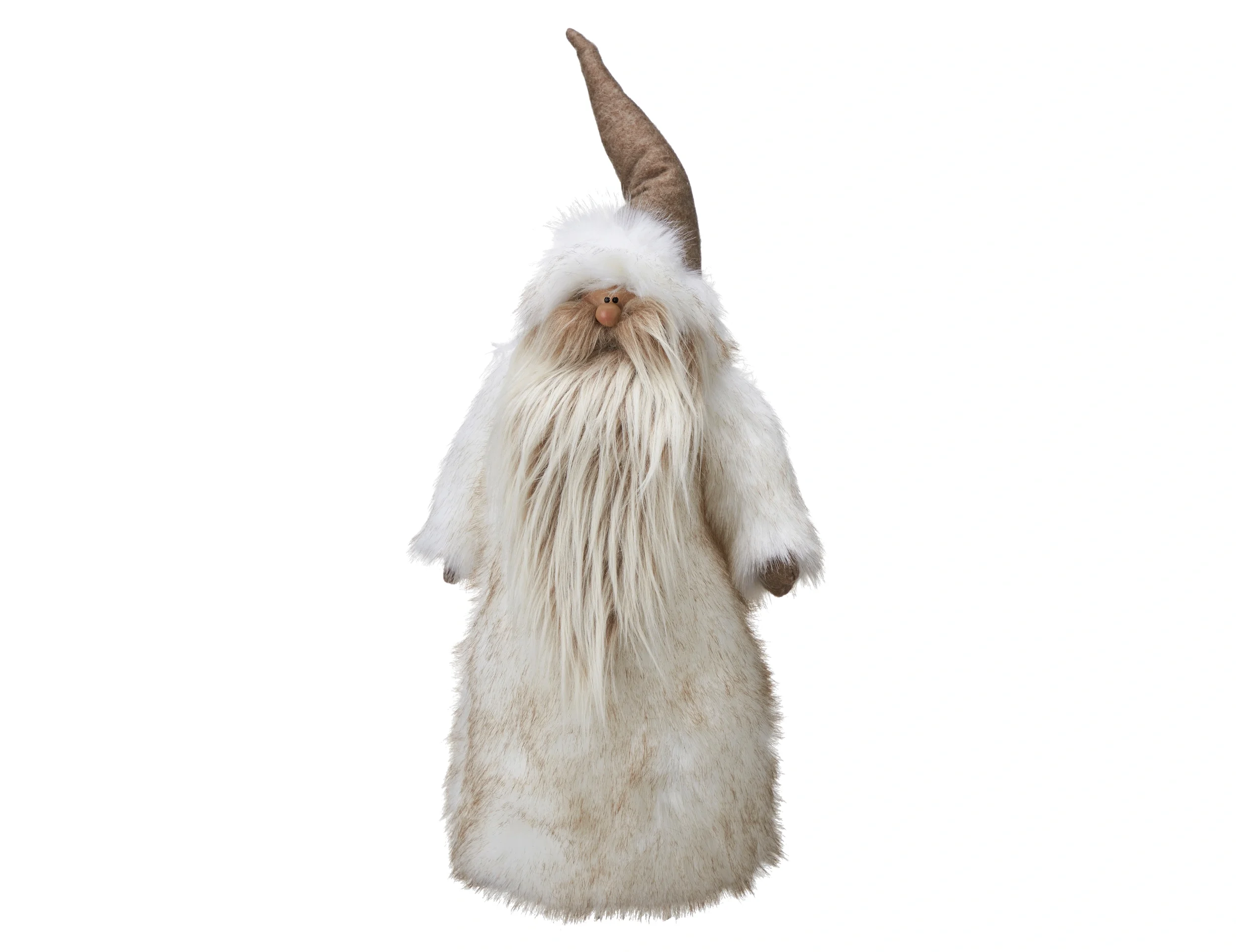 Stående tomte Arvid i mjuk textil. Så fin med sin pälskappa och långa skägg.