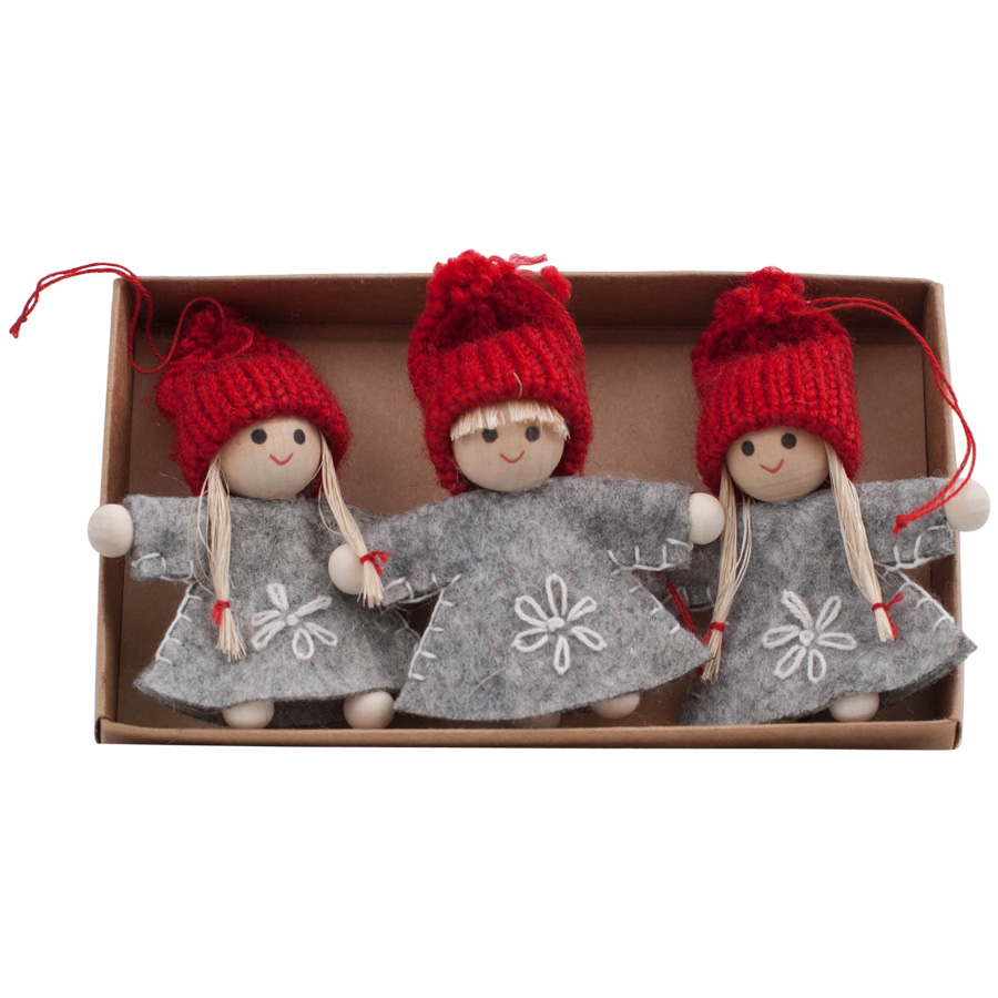 Tre små söta tomteflickor i tyg/filt att hänga i granen.