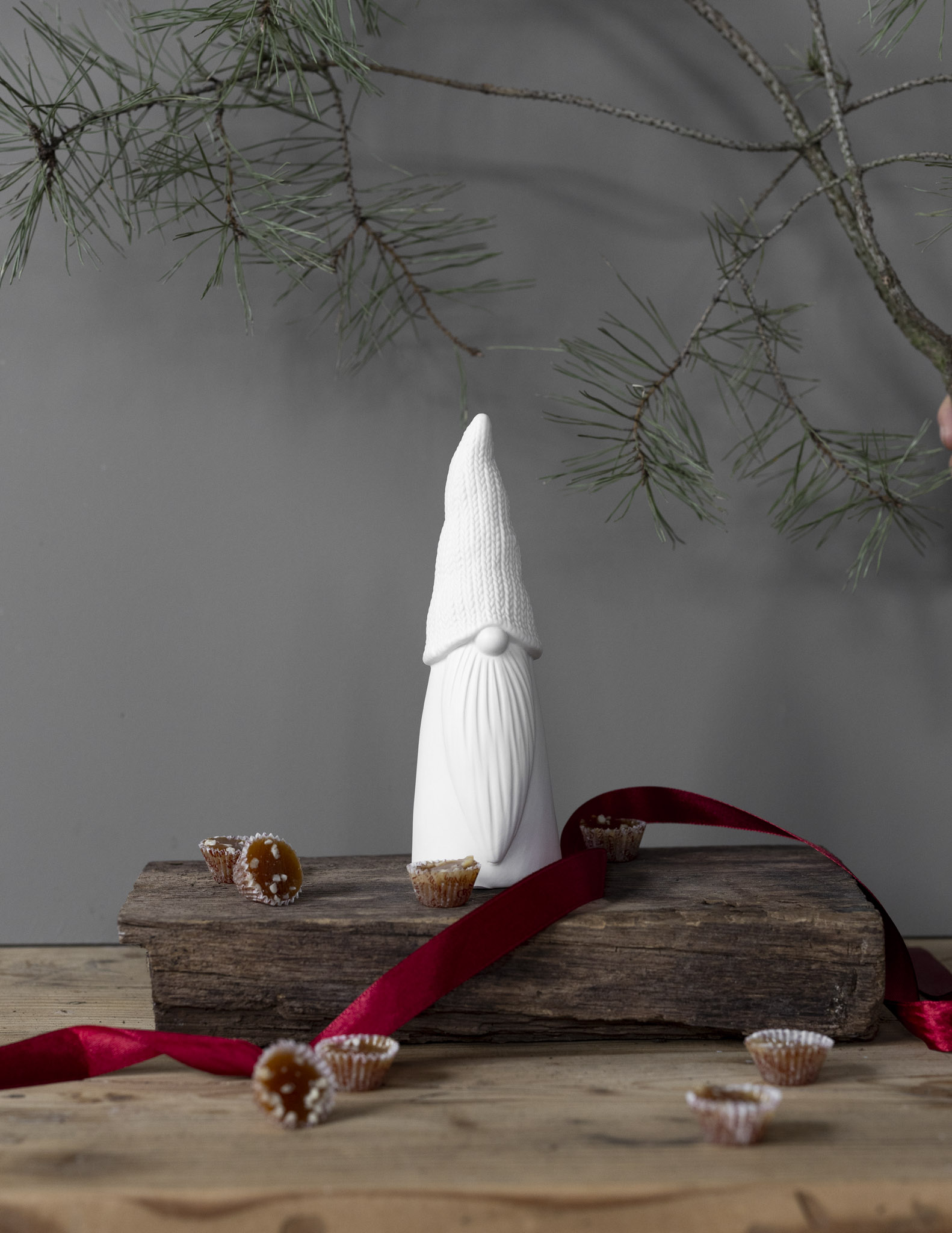 En dekorativ jultomte Kurt i vit matt keramik. En söt detalj att pynta med, passar lika bra på fönsterbrädan som på köksbordet. Den gör sig även väldigt fin tillsammans med våra vita ljushus.