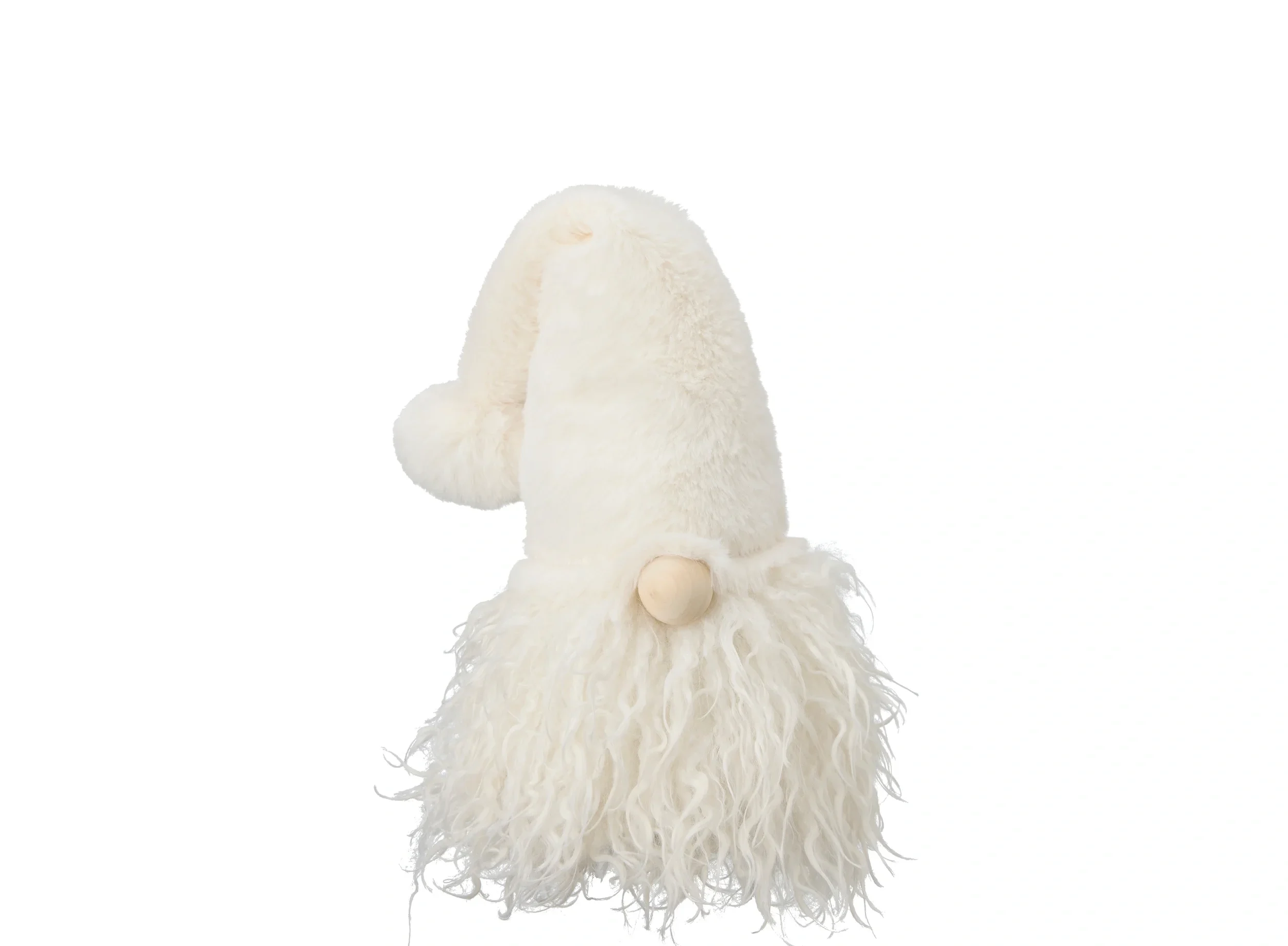 Sittande tomte Ludvig i vit textil med luva neddragen över ansiktet. Tyngd i baken.