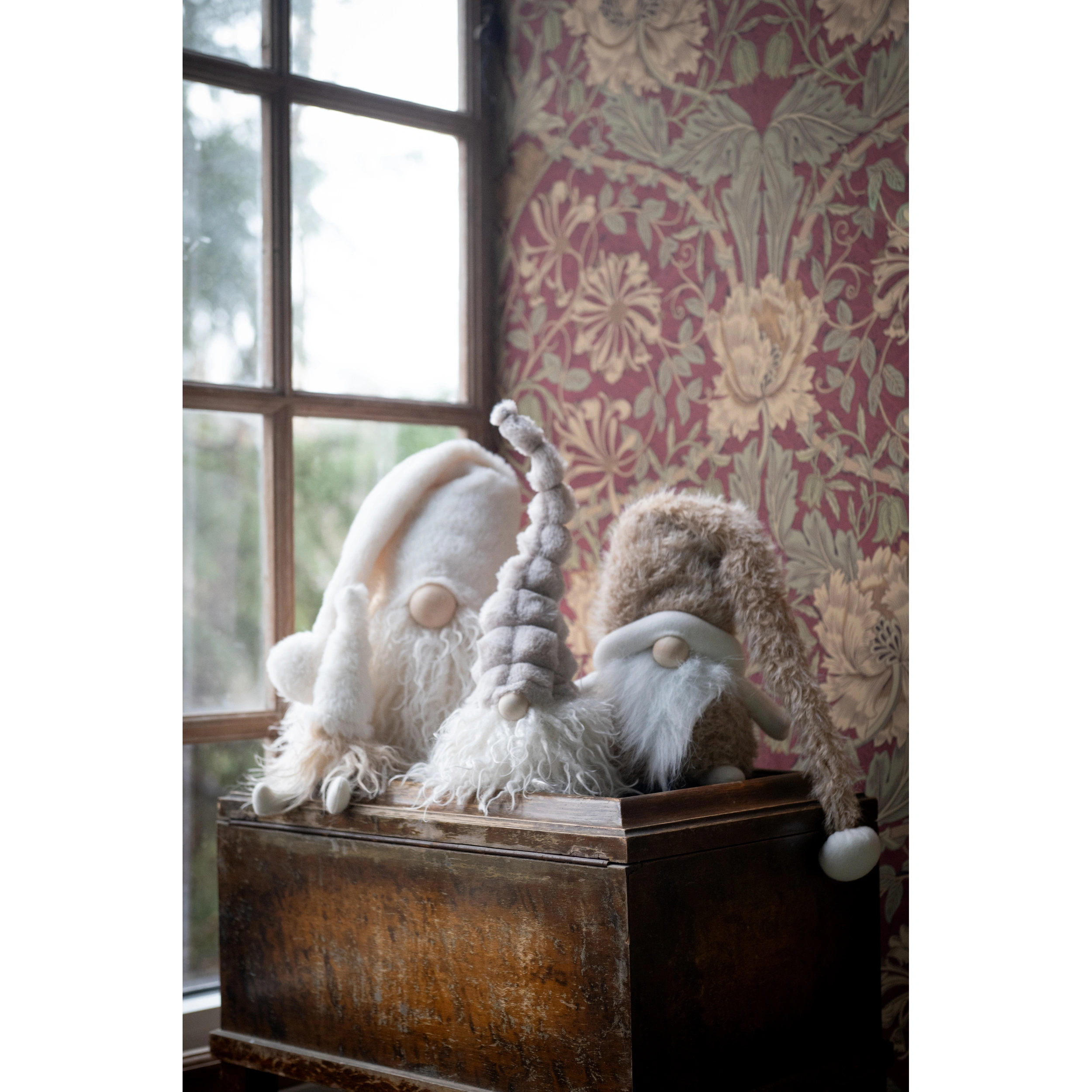 Den mjukaste gosigaste tomten av dem alla! Sittande mjuk tomte i textil, Ludvig med luva neddragen över ansiktet. Tyngd i baken.