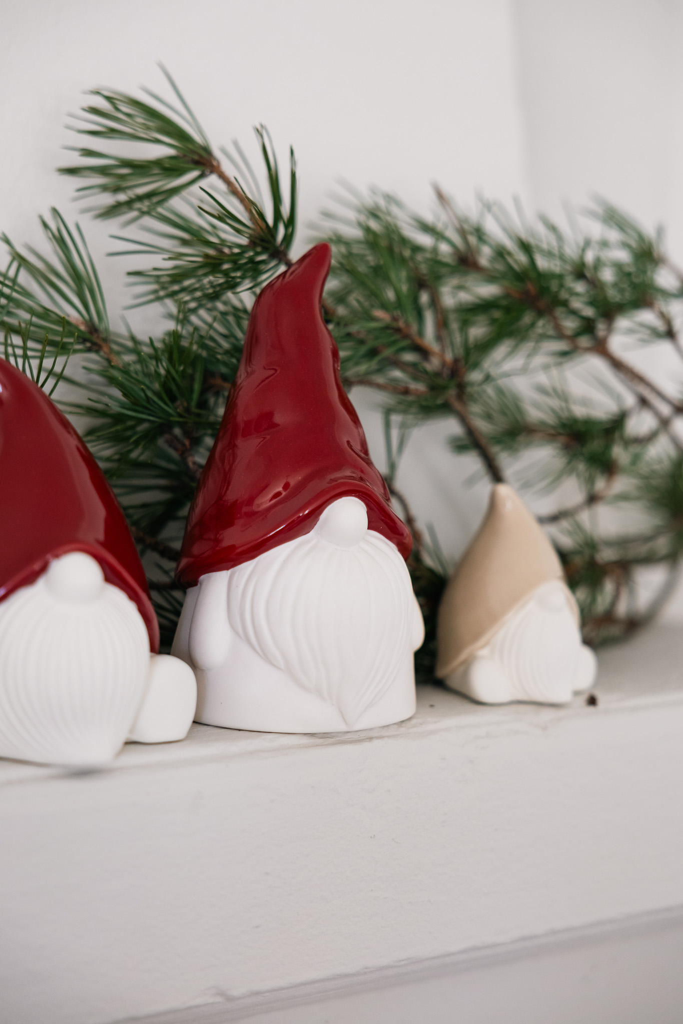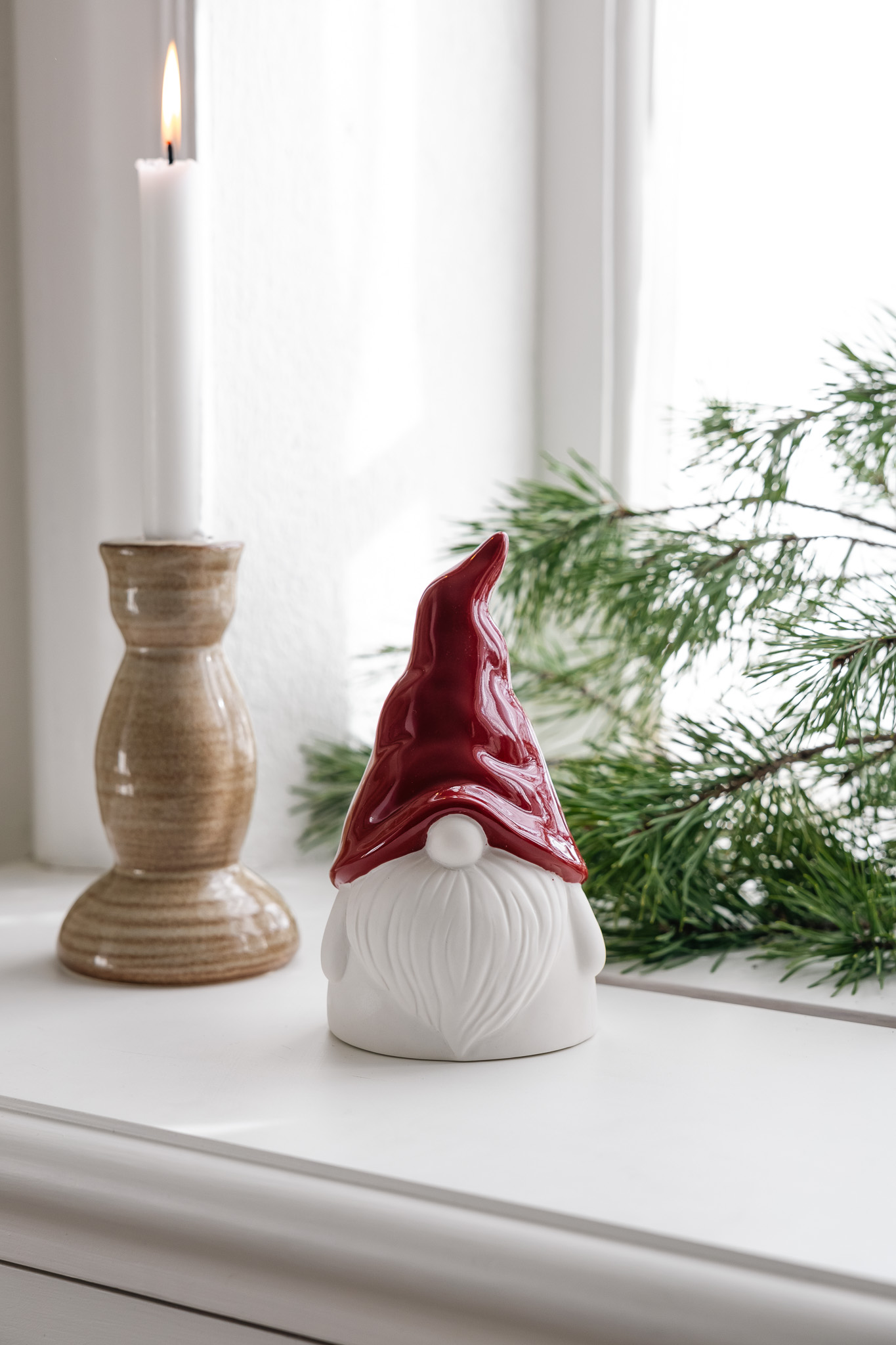 Jultomte Tryggve i vit matt keramik och en röd glaserad luva. En söt juldekoration att pynta med, passar lika bra på fönsterbrädan som på köksbordet.