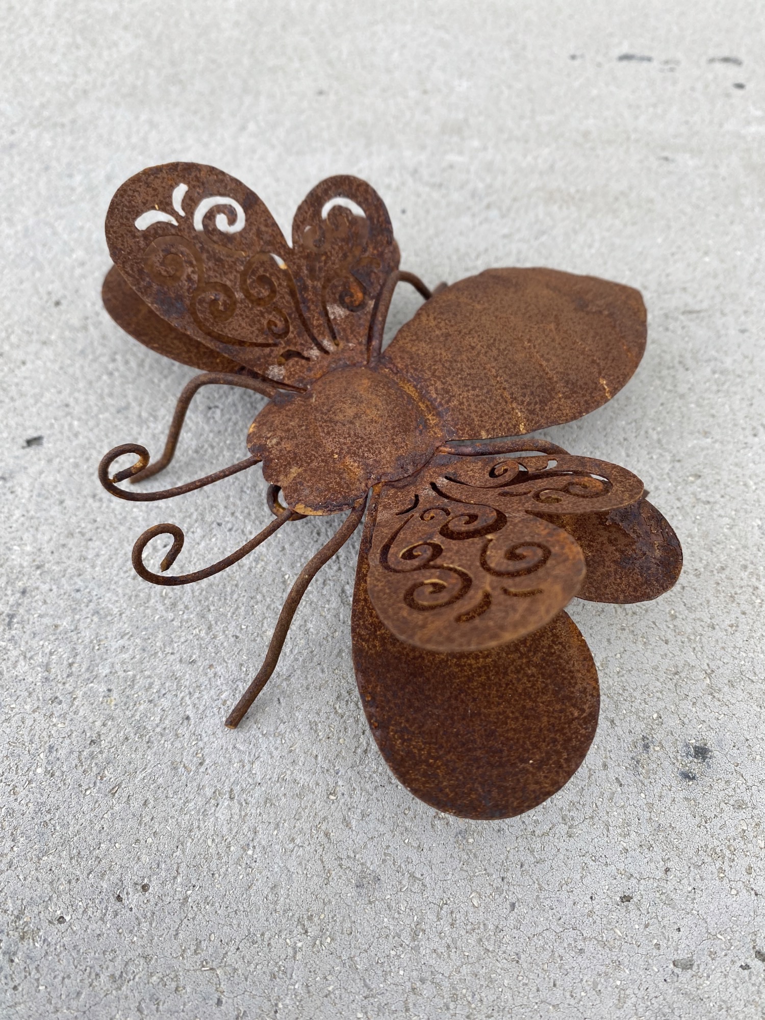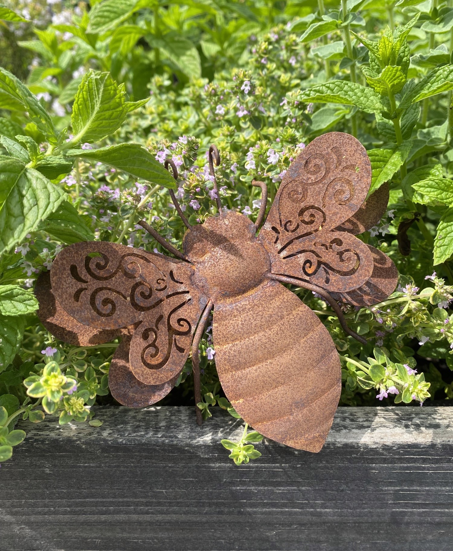 En söt trädgårdsdekoration i form av en dekorativ humla i rostigt järn. Humlan är inte platt utan benen & vingarna är böjda, ca 3 cm hög. Går både att ställa eller hänga upp.