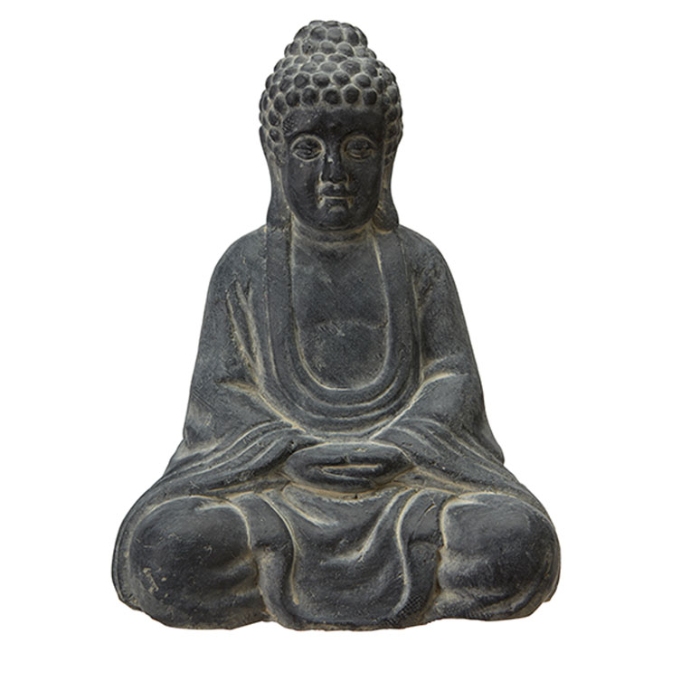 Underbar trädgårdsdekoration i form av en sittande glad Buddhastaty i mörkgrå terrakotta.