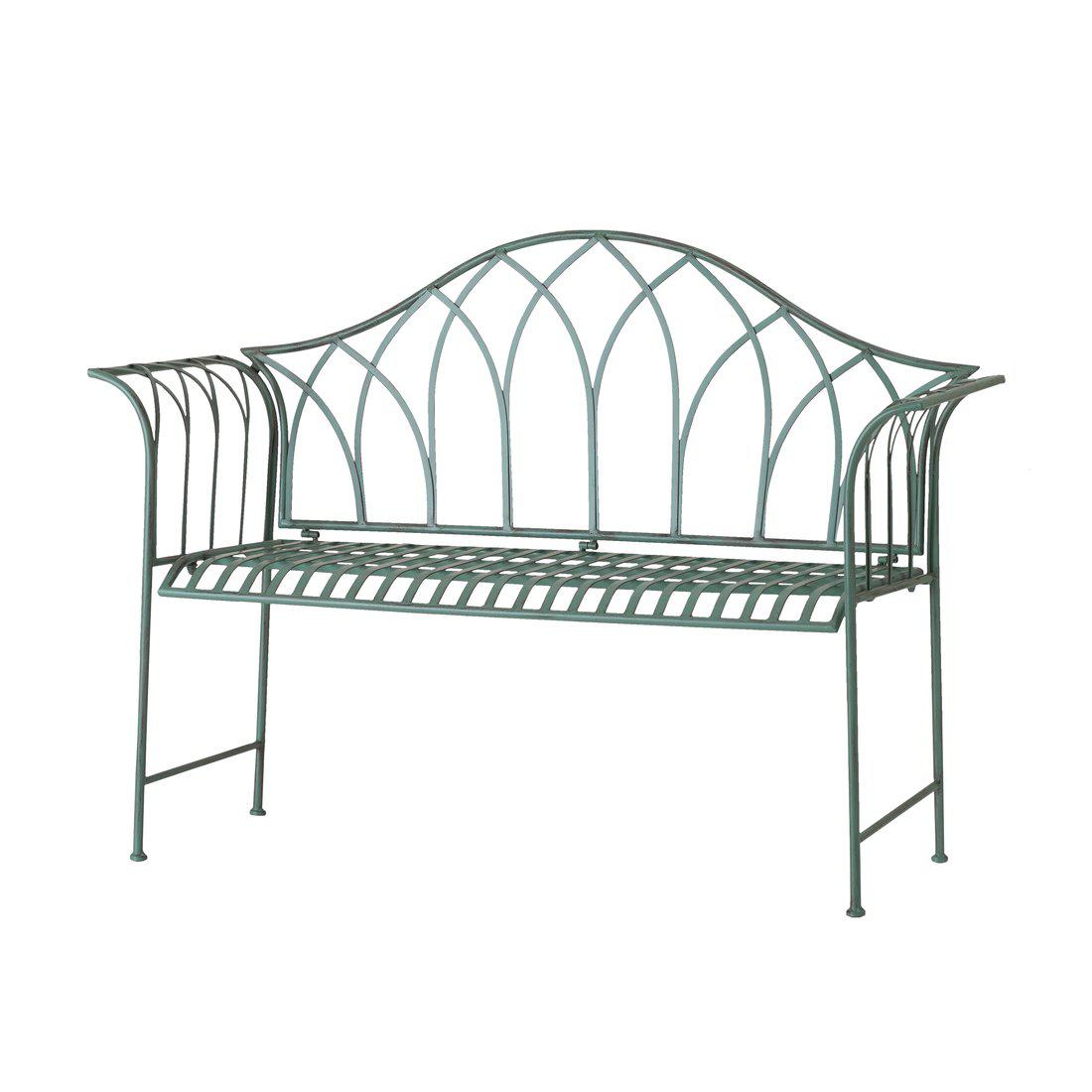 En alldeles underbar trädgårdssoffa / bänk i metall med dekorerad rygg och vackra sirliga detaljer. Målad i grågrönt med en härlig patinering av rost. Fin att ha i trädgården, på balkongen eller altanen. Komplettera med vårt caféset i samma serie.