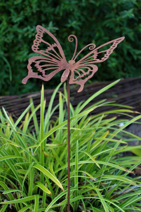 En trädgårdsdekoration i form av en söt fjäril i rost på pinne att sticka ner i en stor blomkruka eller i trädgården. Den passar även väldigt fint på graven.