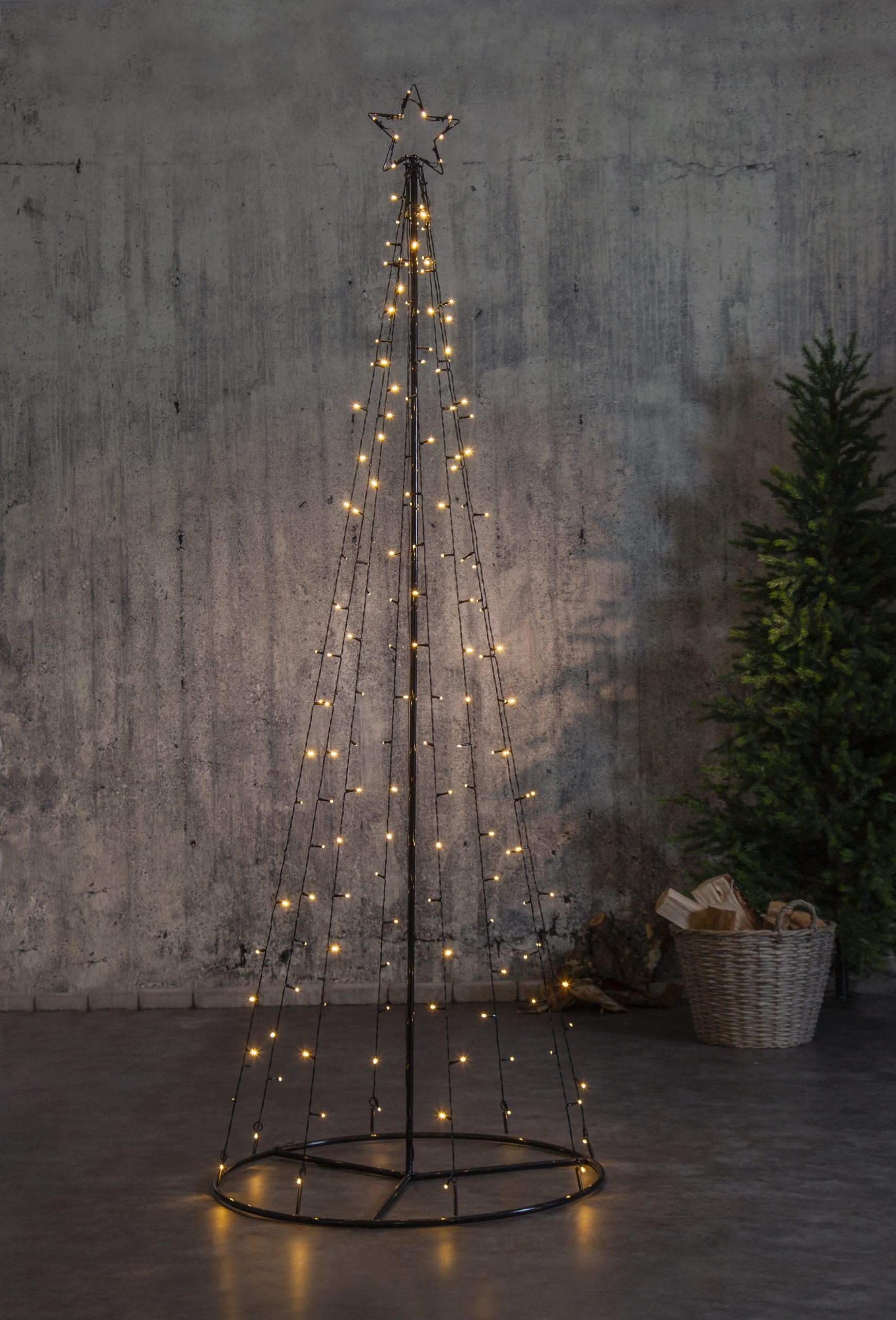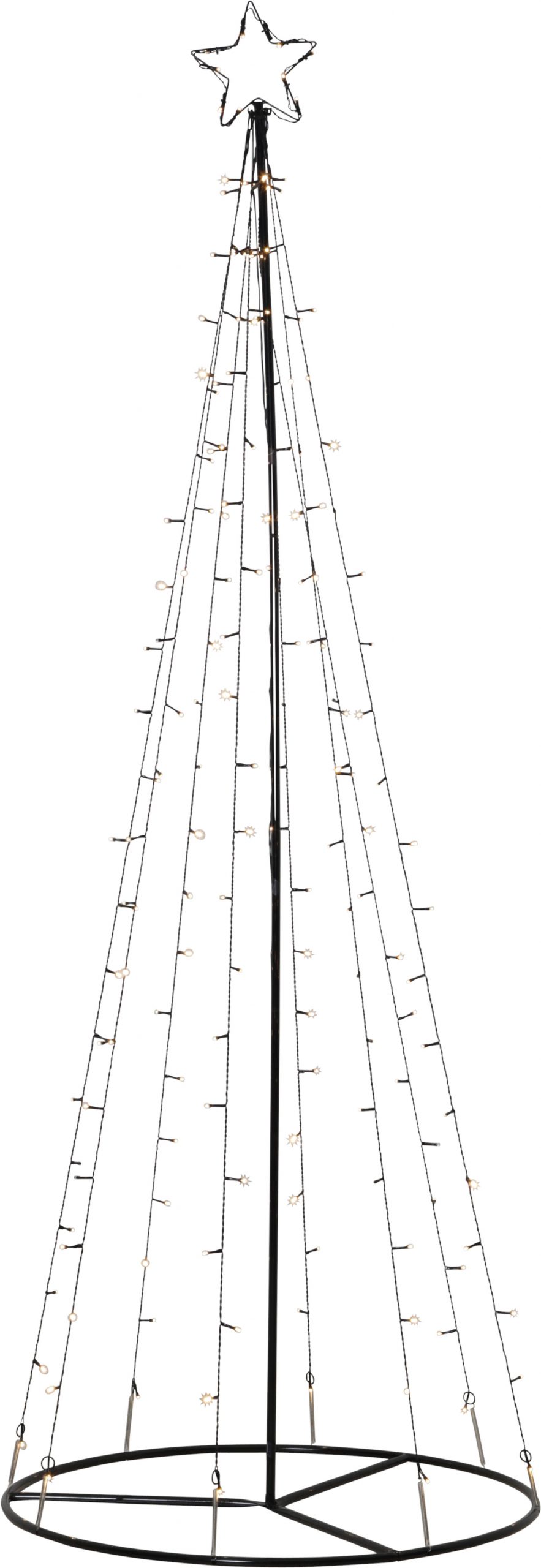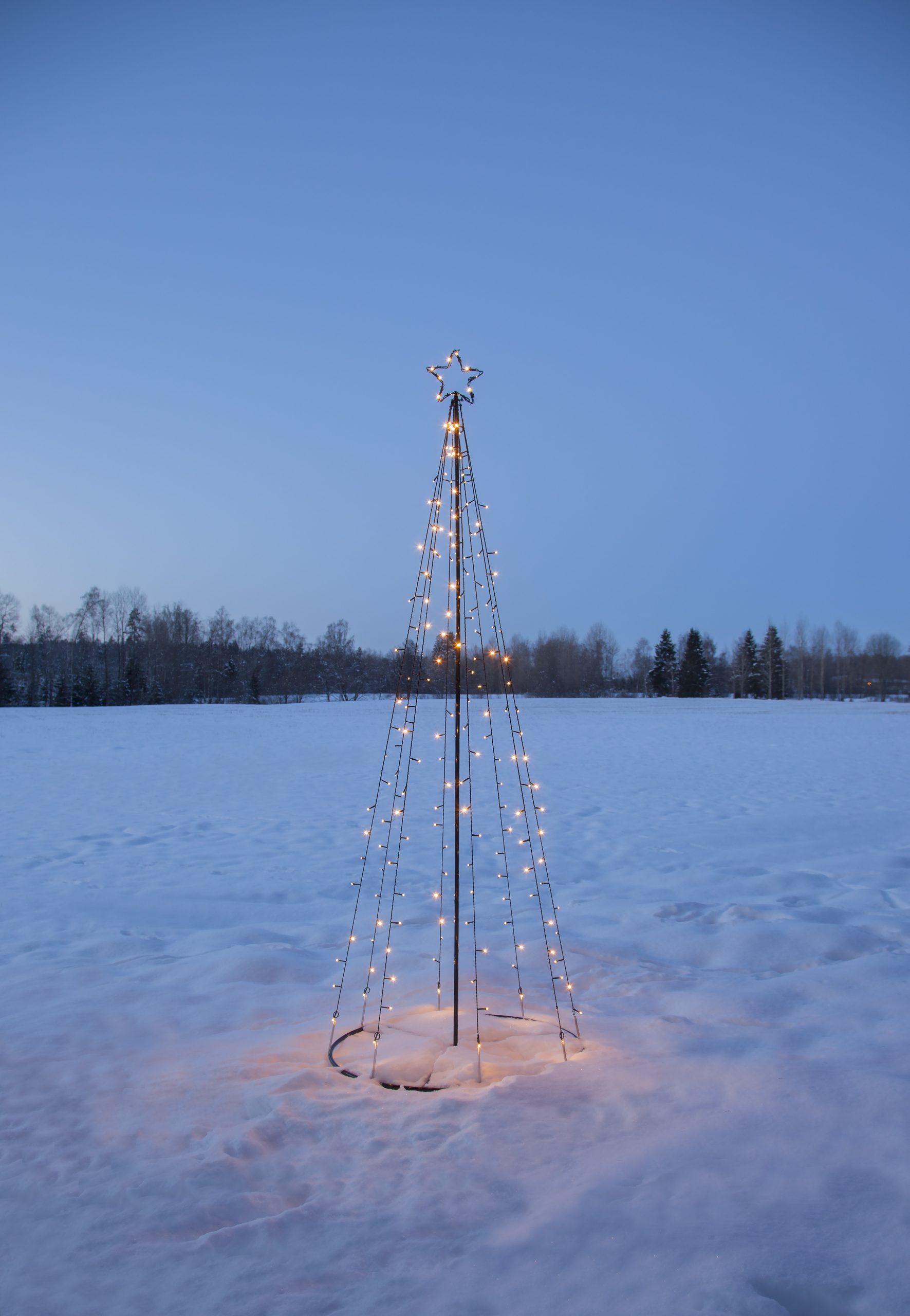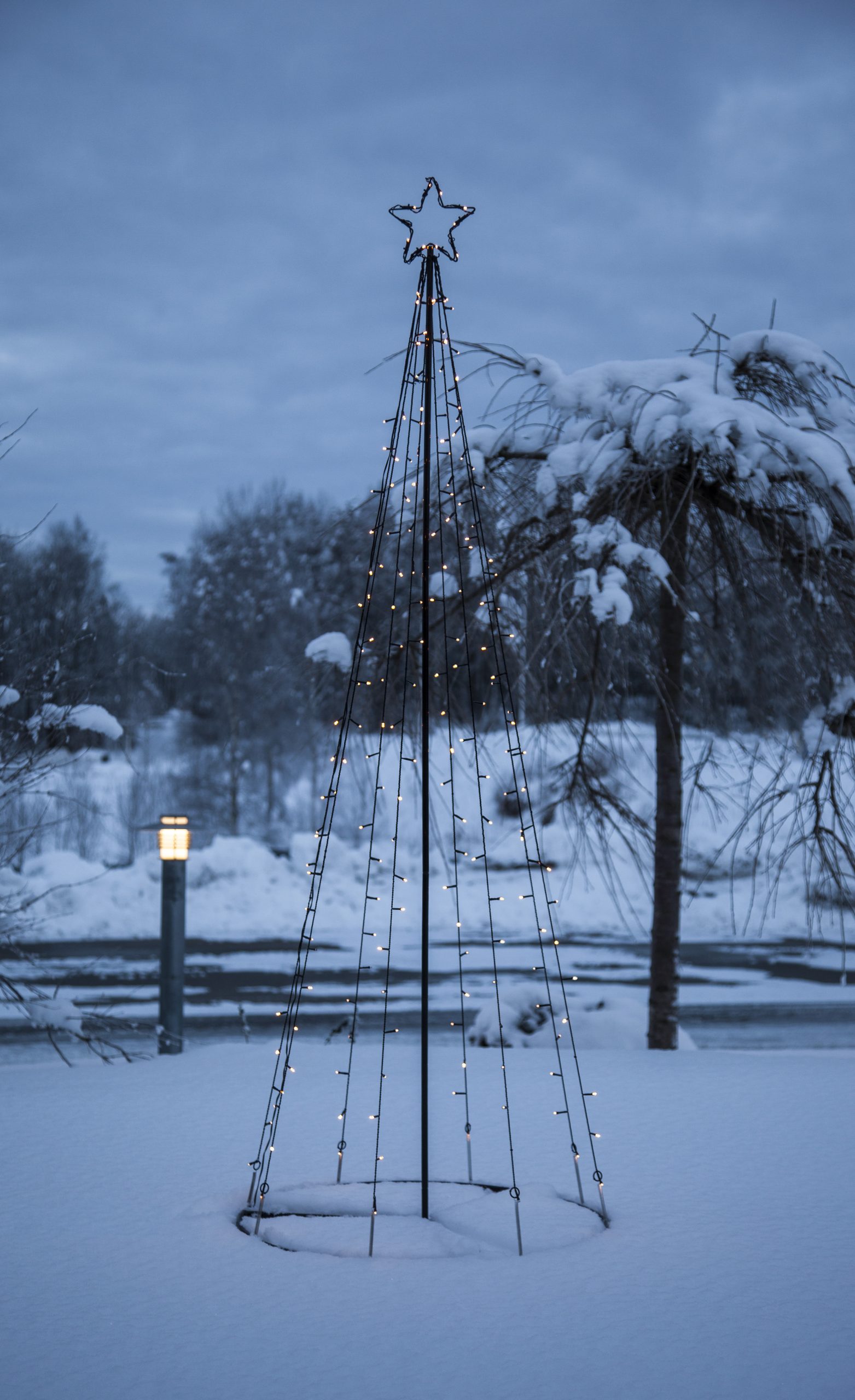 En dekorativ utomhusdekoration i form av en julgran med 170 LED-ljuskällor, varav 17 utav ljusen blinkar. Trädet är 210 cm högt och ger ifrån sig ett mysigt varmvitt sken. Vacker dekoration att ha i trädgården eller på framsidan av huset.