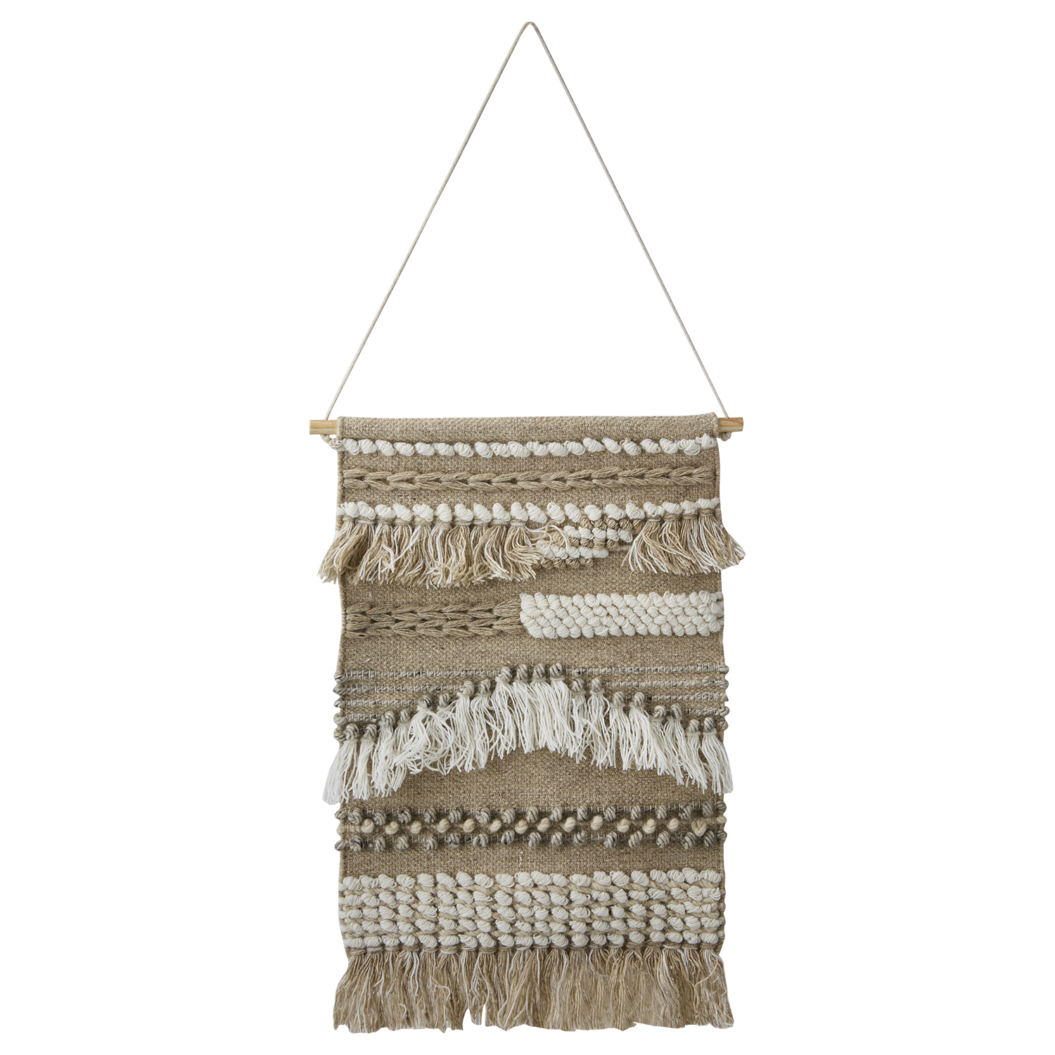 Dekorativ väggdekoration med vackra detaljer i handvävd bomull och ull. Väggdekorationen är handgjord med omsorg och utstrålar ett lugnt och naturligt uttryck. De mjuka tonerna i beige och elfenben skapar en harmonisk känsla som ger rummet värme och balans. Den taktila strukturen och det genuina hantverket gör varje väggdekoration unik – ett textilt konstverk som förhöjer helheten.