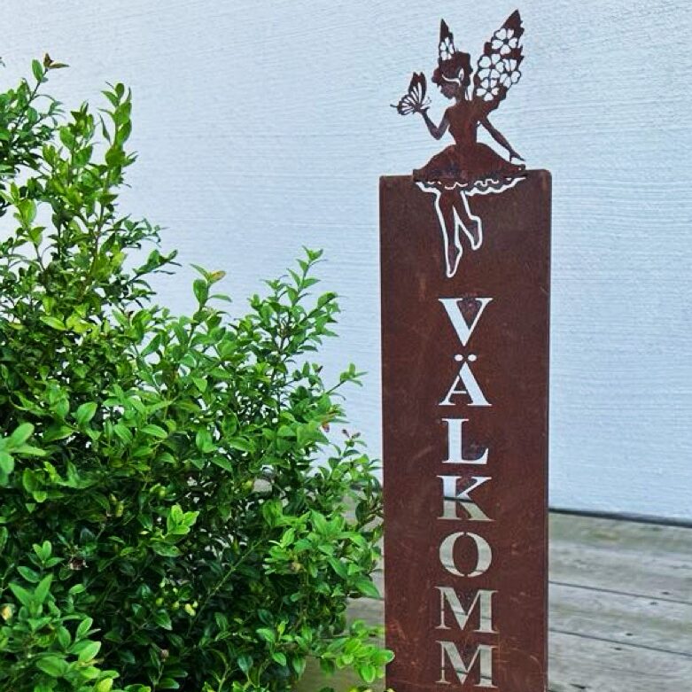 Dekorativ välkommen skylt i rostigt järn med en Älva på toppen. Passar lika bra i trädgården, som i rabatten eller i en större kruka.